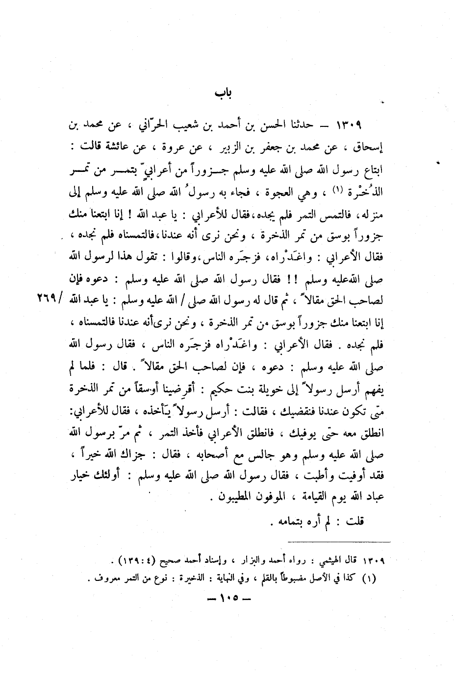 1309 - حَدَّثَنَا الْحَسَنُ بْنُ أَحْمَدَ بْنِ شُعَيْبٍ الْحَرَّانِيُّ، عَنْ مُحَمَّدِ بْنِ إِسْحَاقَ، عَنْ مُحَمَّدِ بْنِ جَعْفَرِ بْنِ الزُّبَيْرِ، عَنْ عُرْوَةَ، عَنْ عَائِشَةَ، قَالَتْ: ابْتَاعَ رَسُولُ اللَّهِ صَلَّى اللَّهُ عَلَيْهِ وَسَلَّمَ جَزُورًا مِنْ أَعْرَابِيٍّ بِتَمْرٍ مِنْ تَمْرِ الذُّخْرَةِ، وَهِيَ الْعَجْوَةُ، فَجَاءَ بِهِ رَسُولَ اللَّهِ صَلَّى اللَّهُ عَلَيْهِ وَسَلَّمَ إِلَى مَنْزِلِهِ، فَالْتَمَسَ التَّمْرَ فَلَمْ يَجِدْهُ، فَقَالَ لِلأَعْرَابِيِّ: «يَا عَبْدَ اللَّهِ، إِنَّا ابْتَعْنَا مِنْكَ جَزُورًا بِوَسْقٍ مِنْ تَمْرِ الذُّخْرَةِ، وَنَحْنُ نَرَى أَنَّهُ عِنْدَنَا، فَالْتَمَسْنَاهُ فَلَمْ نَجِدْهُ» ، فَقَالَ الأَعْرَابِيُّ: وَاغَدْرَاهْ، فَزَجَرَهُ النَّاسُ، وَقَالُوا: تَقُولُ هَذَا لِرَسُولِ اللَّهِ صَلَّى اللَّهُ عَلَيْهِ وَسَلَّمَ! فَقَالَ رَسُولُ اللَّهِ صَلَّى اللَّهُ عَلَيْهِ وَسَلَّمَ: «دَعُوهُ فَإِنَّ لِصَاحِبِ الْحَقِّ مَقَالا» ، ثُمَّ قَالَ لَهُ رَسُولُ اللَّهِ صَلَّى اللَّهُ عَلَيْهِ وَسَلَّمَ: «يَا عَبْدَ اللَّهِ، إِنَّا ابْتَعْنَا مِنْكَ جَزُورًا بِوَسْقٍ مِنْ تَمْرِ الذُّخْرَةِ، وَنَحْنُ نَرَى أَنَّهُ عِنْدَنَا فَالْتَمَسْنَاهُ، فَلَمْ نَجِدْهُ» ، فَقَالَ الأَعْرَابِيُّ: وَاغَدْرَاهُ، فَزَجَرَهُ النَّاسُ، فَقَالَ رَسُولُ اللَّهِ صَلَّى اللَّهُ عَلَيْهِ وَسَلَّمَ: «دَعُوهُ، فَإِنَّ لِصَاحِبِ الْحَقِّ مَقَالا،» ، قَالَ: فَلَمَّا لَمْ يَفْهَمْ، أَرْسَلَ رَسُولا إِلَى خُوَيْلَةَ بِنْتِ حَكِيمٍ: «أَقْرِضِينَا أَوْسُقًا مِنْ تَمْرِ الذُّخْرَةِ، مَتَى تَكُونُ عِنْدَنَا فَنَقْضِيَكِ» ، فَقَالَتْ: أَرْسِلْ رَسُولا يَأْخُذُهُ، فَقَالَ لِلأَعْرَابِيِّ: «انْطَلِقْ مَعَهُ حَتَّى يُوَفِّيَكَ» ، فَانْطَلَقَ الأَعْرَابِيُّ فَأَخَذَ التَّمْرَ، ثُمَّ مَرَّ بِرَسُولِ اللَّهِ صَلَّى اللَّهُ عَلَيْهِ وَسَلَّمَ وَهُوَ جَالِسٌ مَعَ أَصْحَابِهِ، فَقَالَ: جَزَاكَ اللَّهُ خَيْرًا، فَقَدْ أَوْفَيْتَ وَأَطَبْتَ، فَقَالَ رَسُولُ اللَّهِ صَلَّى اللَّهُ عَلَيْهِ وَسَلَّمَ: «أُولَئِكَ خِيَارُ عِبَادِ اللَّهِ يَوْمَ الْقِيَامَةِ، الْمُوفُونَ الْمُطِيبُونَ» .
