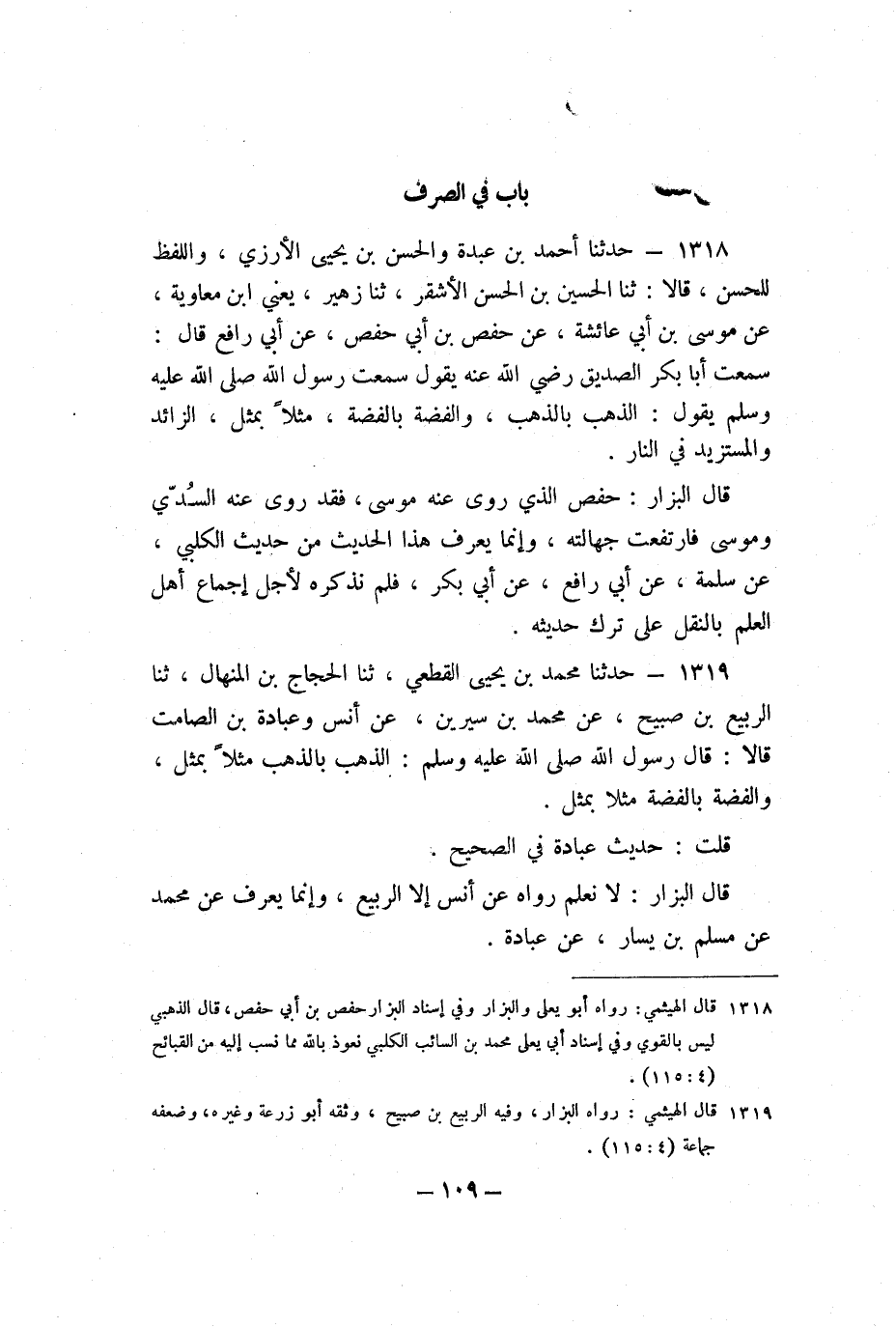 1318 - حَدَّثَنَا أَحْمَدُ بْنُ عَبْدَةَ، وَالْحَسَنُ بْنُ يَحْيَى الأَرُزِّيُّ، وَاللَّفْظُ لِلْحَسَنِ، قَالا: ثنا الْحُسَيْنُ بْنُ الْحَسَنِ الأَشْقَرُ، ثنا زُهَيْرٌ، يَعْنِي: ابْنَ مُعَاوِيَةَ، عَنْ مُوسَى بْنِ أَبِي عَائِشَةَ، عَنْ حَفْصِ بْنِ أَبِي حَفْصٍ، عَنْ أَبِي رَافِعٍ، قَالَ: سَمِعْتُ أَبَا بَكْرٍ الصِّدِّيقَ رَضِيَ اللَّهُ عَنْهُ يَقُولُ: سَمِعْتُ رَسُولَ اللَّهِ صَلَّى اللَّهُ عَلَيْهِ وَسَلَّمَ يَقُولُ: «الذَّهَبُ بِالذَّهَبِ، وَالْفِضَّةُ بِالْفِضَّةِ، مِثْلا بِمِثْلٍ، الزَّائِدُ وَالْمُسْتَزِيدُ فِي النَّارِ» .