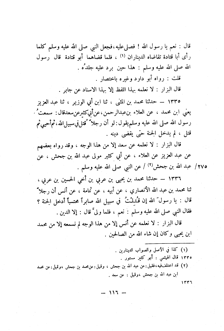 1335 - نَا مُحَمَّدُ بْنُ الْمُثَنَّى، ثنا ابْنُ أَبِي الْوَزِيرِ، ثنا عَبْدُ الْعَزِيزِ، يَعْنِي: ابْنَ مُحَمَّدٍ، عَنِ الْعَلاءِ بْنِ عَبْدِ الرَّحْمَنِ، عَنْ أَبِي كَثِيرٍ، عَنْ سَعْدٍ، قَالَ: سَمِعْتُ رَسُولَ اللَّهِ صَلَّى اللَّهُ عَلَيْهِ وَسَلَّمَ يَقُولُ: «لَوْ أَنَّ رَجُلا قُتِلَ فِي سَبِيلِ اللَّهِ، ثُمَّ أُحْيِيَ، ثُمَّ قُتِلَ، لَمْ يَدْخُلِ الْجَنَّةَ حَتَّى يُقْضَى دَيْنُهُ» .
