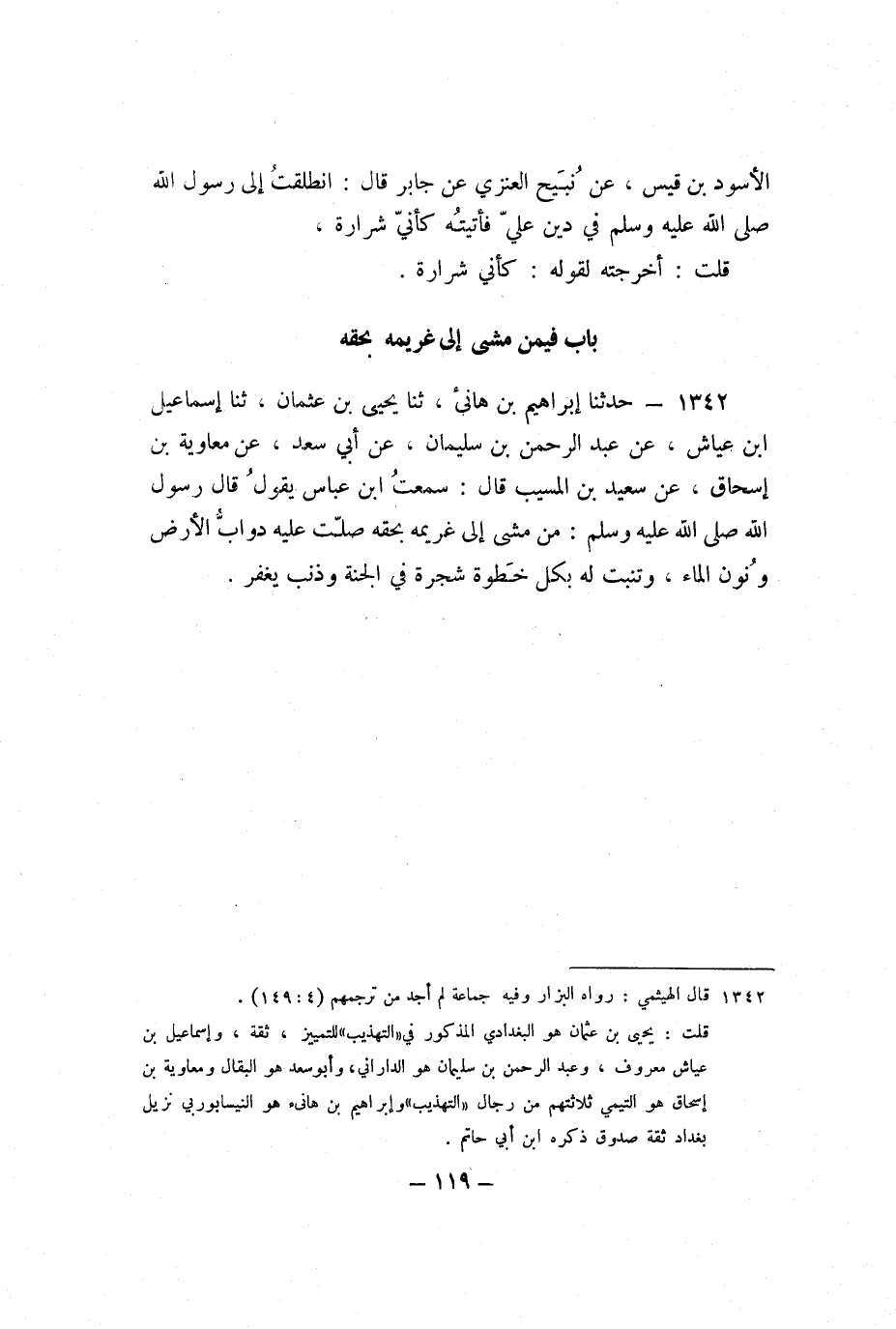 1342 - حَدَّثَنَا إِبْرَاهِيمُ بْنُ هَانِئٍ، ثنا يَحْيَى بْنُ عُثْمَانَ، ثنا إِسْمَاعِيلُ بْنُ عَيَّاشٍ، عَنْ عَبْدِ الرَّحْمَنِ بْنِ سُلَيْمَانَ، عَنْ أَبِي سَعْدٍ، عَنْ مُعَاوِيَةَ بْنِ إِسْحَاقَ، عَنْ سَعِيدِ بْنِ الْمُسَيِّبِ، قَالَ: سَمِعْتُ ابْنَ عَبَّاسٍ يَقُولُ: قَالَ رَسُولُ اللَّهِ صَلَّى اللَّهُ عَلَيْهِ وَسَلَّمَ: «مَنْ مَشَى إِلَى غَرِيمِهِ بِحَقِّهِ صَلَّتْ عَلَيْهِ دَوَابُّ الأَرْضِ وَنُونُ الْمَاءِ، وَتَنْبُتُ لَهُ بِكُلِّ خُطْوَةٍ شَجَرَةٌ فِي الْجَنَّةِ وَذَنْبٌ يُغْفَرُ» .
