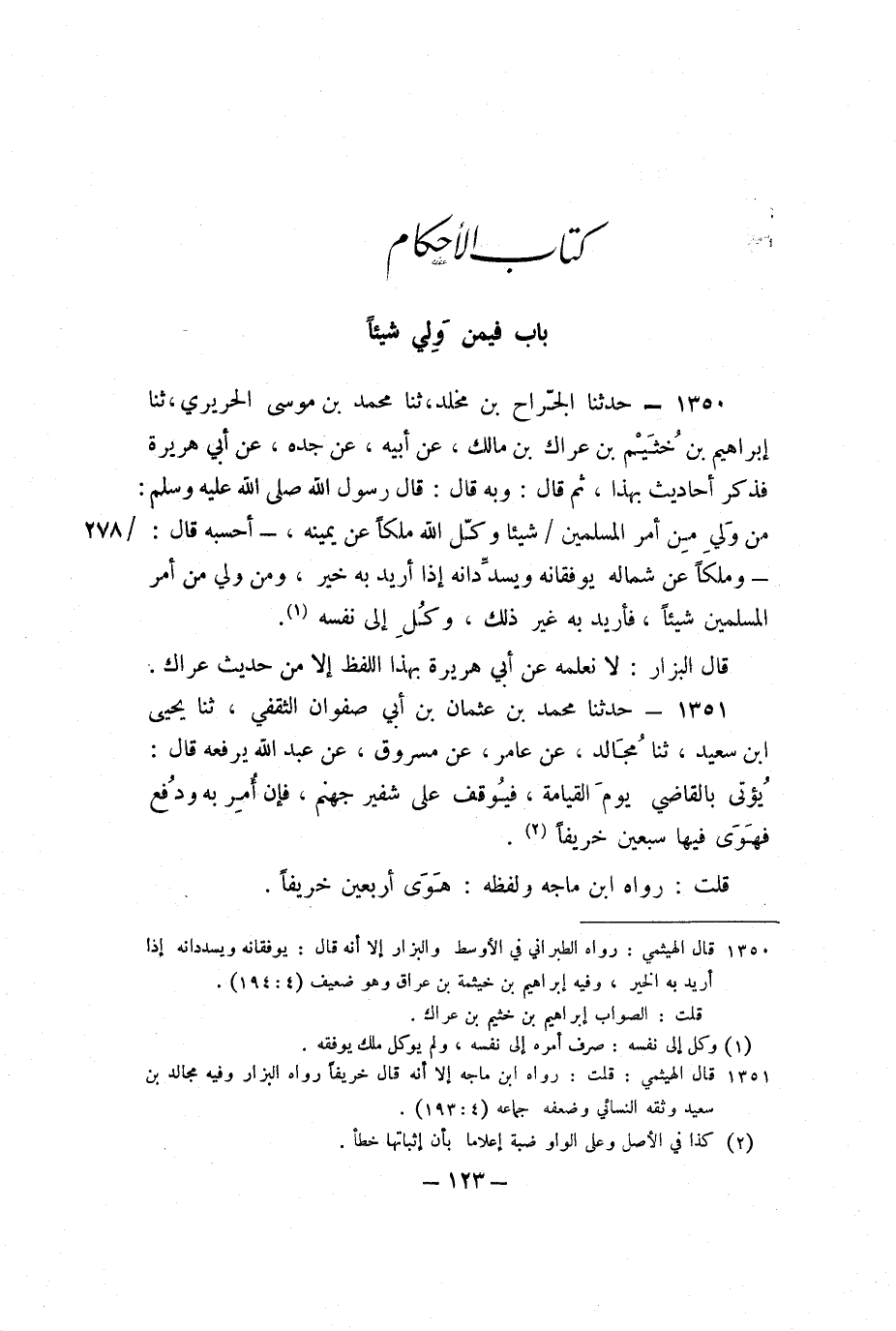 1350 - حَدَّثَنَا الْجَرَّاحُ بْنُ مَخْلَدٍ، ثنا مُحَمَّدُ بْنُ مُوسَى الْحَرِيرِيُّ، ثنا إِبْرَاهِيمُ بْنُ خُثَيْمِ بْنِ عِرَاكِ بْنِ مَالِكٍ، عَنْ أَبِيهِ، عَنْ جَدِّهِ، عَنْ أَبِي هُرَيْرَةَ، فَذَكَرَ أَحَادِيثَ بِهَذَا، ثُمَّ قَالَ: وَبِهِ قَالَ: قَالَ رَسُولُ اللَّهِ صَلَّى اللَّهُ عَلَيْهِ وَسَلَّمَ: «مَنْ وَلِيَ مِنْ أَمْرِ الْمُسْلِمِينَ شَيْئًا وَكَّلَ اللَّهُ مَلَكًا عَنْ يَمِينِهِ، أَحْسِبُهُ قَالَ، وَمَلَكًا عَنْ شِمَالِهِ، يُوَفِّقَانِهِ وَيُسَدِّدَانِهِ إِذَا أُرِيدَ بِهِ خَيْرٌ، وَمَنْ وَلِيَ مِنْ أَمْرِ الْمُسْلِمِينَ شَيْئًا، فَأُرِيدَ بِهِ غَيْرُ ذَلِكَ، وُكِلَ إِلَى نَفْسِهِ» .