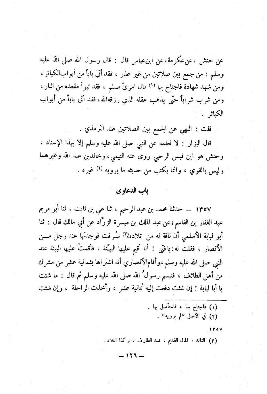 عَنْ حَنَشٍ، عَنْ عِكْرِمَةَ، عَنِ ابْنِ عَبَّاسٍ، قَالَ: قَالَ رَسُولُ اللَّهِ صَلَّى اللَّهُ عَلَيْهِ وَسَلَّمَ: «مَنْ جَمَعَ بَيْنَ صَلاتَيْنِ مِنْ غَيْرِ عُذْرٍ، فَقَدْ أَتَى بَابًا مِنْ أَبْوَابِ الْكَبَائِرِ، وَمَنْ شَهِدَ شَهَادَةً فَاجْتَاحَ بِهَا مَالَ امْرِئٍ مُسْلِمٍ، فَقَدْ تَبَوَّأَ مَقْعَدَهُ مِنَ النَّارِ، وَمَنْ شَرِبَ شَرَابًا حَتَّى يَذْهَبُ عَقْلُهُ الَّذِي رَزَقَهُ اللَّهُ، فَقَدْ أَتَى بَابًا مِنْ أَبْوَابِ الْكَبَائِرِ» .