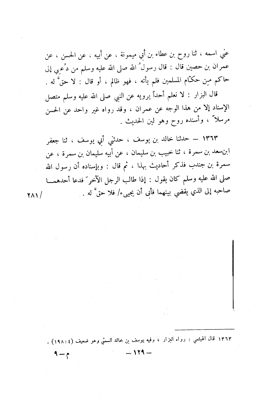 قَالَ الْبَزَّارُ: لا نَعْلَمُ أَحَدًا يَرْوِيهِ عَنِ النَّبِيِّ صَلَّى اللَّهُ عَلَيْهِ وَسَلَّمَ مُتَّصِلَ الإِسْنَادِ إِلا مِنْ هَذَا الْوَجْهِ عَنْ عِمْرَانَ، وَقَدْ رَوَاهُ غَيْرُ وَاحِدٍ، عَنِ الْحَسَنِ مُرْسَلا، وَأَسْنَدَهُ رَوْحٌ، وَهُوَ لَيِّنُ الْحَدِيثِ.