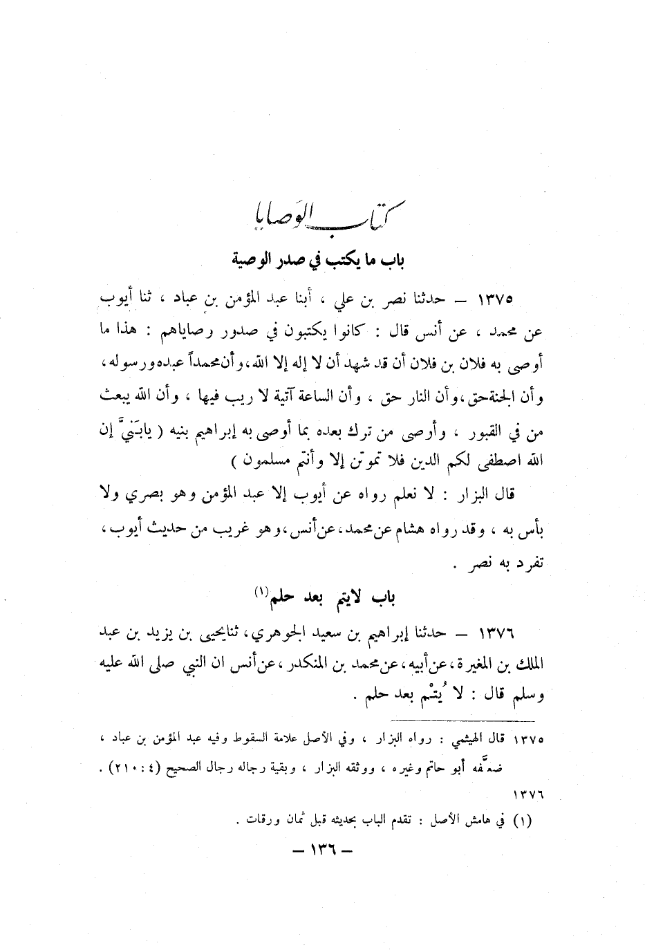 1375 - حَدَّثَنَا نَصْرُ بْنُ عَلِيٍّ، أبنا عَبْدُ الْمُؤْمِنِ بْنُ عَبَّادٍ، ثنا أَيُّوبُ بْنُ مُحَمَّدٍ، عَنْ أنَسٍ، قَالَ: كَانُوا يَكْتُبُونَ فِي صُدُورِ وَصَايَاهُمْ: هَذَا مَا أَوْصَى بِهِ فُلانُ بْنُ فُلانٍ أَنْ قَدْ شَهِدَ أَنْ لا إِلَهَ إِلا اللَّهُ، وَأَنَّ مُحَمَّدًا عَبْدُهُ وَرَسُولُهُ، وَأَنَّ الْجَنَّةَ حَقٌّ، وَأَنَّ النَّارَ حَقٌّ، وَأَنَّ السَّاعَةَ آتِيَةٌ لا رَيْبَ فِيهَا، وَأَنَّ اللَّهَ يَبْعَثُ مَنْ فِي الْقُبُورِ، وَأَوْصَى مَنْ تَرَكَ بَعْدَهُ بِمَا أَوْصَى بِهِ إِبْرَاهِيمُ بَنِيهِ: {يَا بَنِيَّ إِنَّ اللَّهَ اصْطَفَى لَكُمُ الدِّينَ فَلا تَمُوتُنَّ إِلا وَأَنْتُمْ مُسْلِمُونَ} [البقرة: 132] .