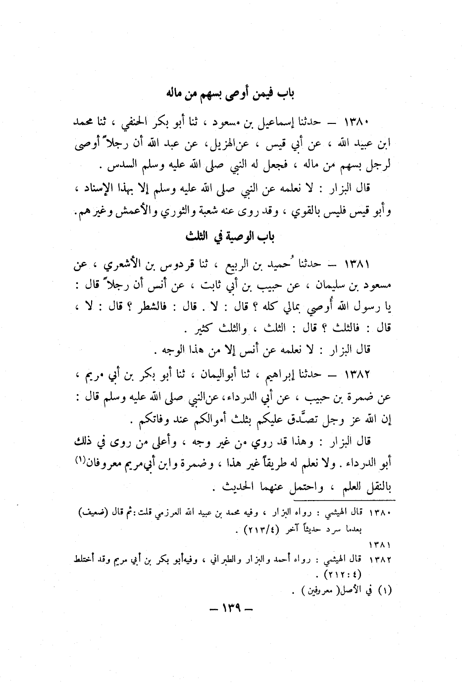 1381 - حَدَّثَنَا حُمَيْدُ بْنُ الرَّبِيعِ، ثنا قُرْدُوسُ بْنُ الأَشْعَرِيِّ، عَنْ مَسْعُودُ بْنُ سُلَيْمَانَ، عَنْ حَبِيبِ بْنِ أَبِي ثَابِتٍ، عَنْ أنَسٍ، أَنَّ رَجُلا قَالَ: يَا رَسُولَ اللَّهِ، أُوصِي بِمَالِي كُلِّهِ؟ قَالَ: «لا» ، قَالَ: فَالشَّطْرُ؟ قَالَ: «لا» ، قَالَ: فَالثُّلُثُ؟ قَالَ: «الثُّلُثُ، وَالثُّلُثُ كَثِيرٌ» .