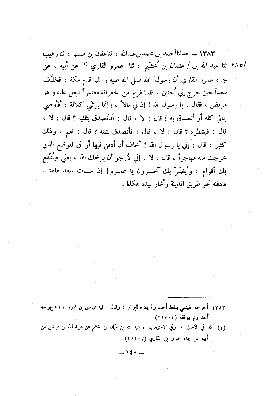 1383 - حَدَّثَنَا أَحْمَدُ بْنُ مُحَمَّدِ بْنِ عيسى الأزهر، ثنا عَفَّانُ بْنُ مُسْلِمٍ، ثنا وُهَيْبٌ، ثنا عَبْدُ اللَّهِ بْنُ عُثْمَانَ بْنِ خُثَيْمٍ، ثنا عَمْرٌو الْقَارِي، عَنْ أَبِيهِ، عَنْ جَدِّهِ عَمْرٍو الْقَارِي، أَنَّ رَسُولَ اللَّهِ صَلَّى اللَّهُ عَلَيْهِ وَسَلَّمَ قَدِمَ مَكَّةَ، فَخَلَّفَ سَعْدًا حِينَ خَرَجَ إِلَى حُنَيْنٍ، فَلَمَّا فَرَغَ مِنَ الْجِعِرَّانَةِ مُعْتَمِرًا دَخَلَ عَلَيْهِ وَهُوَ مَرِيضٌ، فَقَالَ: يَا رَسُولَ اللَّهِ، إِنَّ لِي مَالا، وَإِنَّمَا يَرِثُنِي كَلالَةٌ، أَفَأُوصِي بِمَالِي كُلِّهِ أَوْ أَتَصَدَّقُ بِهِ؟ قَالَ: «لا» ، قَالَ: أَفَأَتَصَدَّقُ بِثُلُثَيْهِ؟ قَالَ: «لا» ، قَالَ: فَبِشَطْرِهِ؟ قَالَ: «لا» ، قَالَ: فَأَتَصَدَّقُ بِثُلُثِهِ؟ قَالَ: «نَعَمْ، وَذَلِكَ كَثِيرٌ» ، قَالَ: إِنِّي يَا رَسُولَ اللَّهِ، أَخَافُ أَنْ أُدْفَنَ فِيهَا أَوْ فِي الْمَوْضِعِ الَّذِي خَرَجْتُ مِنْهُ مُهَاجِرًا، قَالَ: " لا، إِنِّي لأَرْجُو أَنْ يَرْفَعَكَ اللَّهُ، يَعْنِي: فَيُنْفَعَ بِكَ أَقْوَامٌ، وَيُضَرُّ بِكَ آخَرُونَ، يَا عَمْرُو، إِنْ مَاتَ سَعْدٌ هَهُنَا، فَادْفِنْهُ نَحْوَ طَرِيقِ الْمَدِينَةِ وَأَشَارَ بِيَدِهِ هَكَذَا ".
