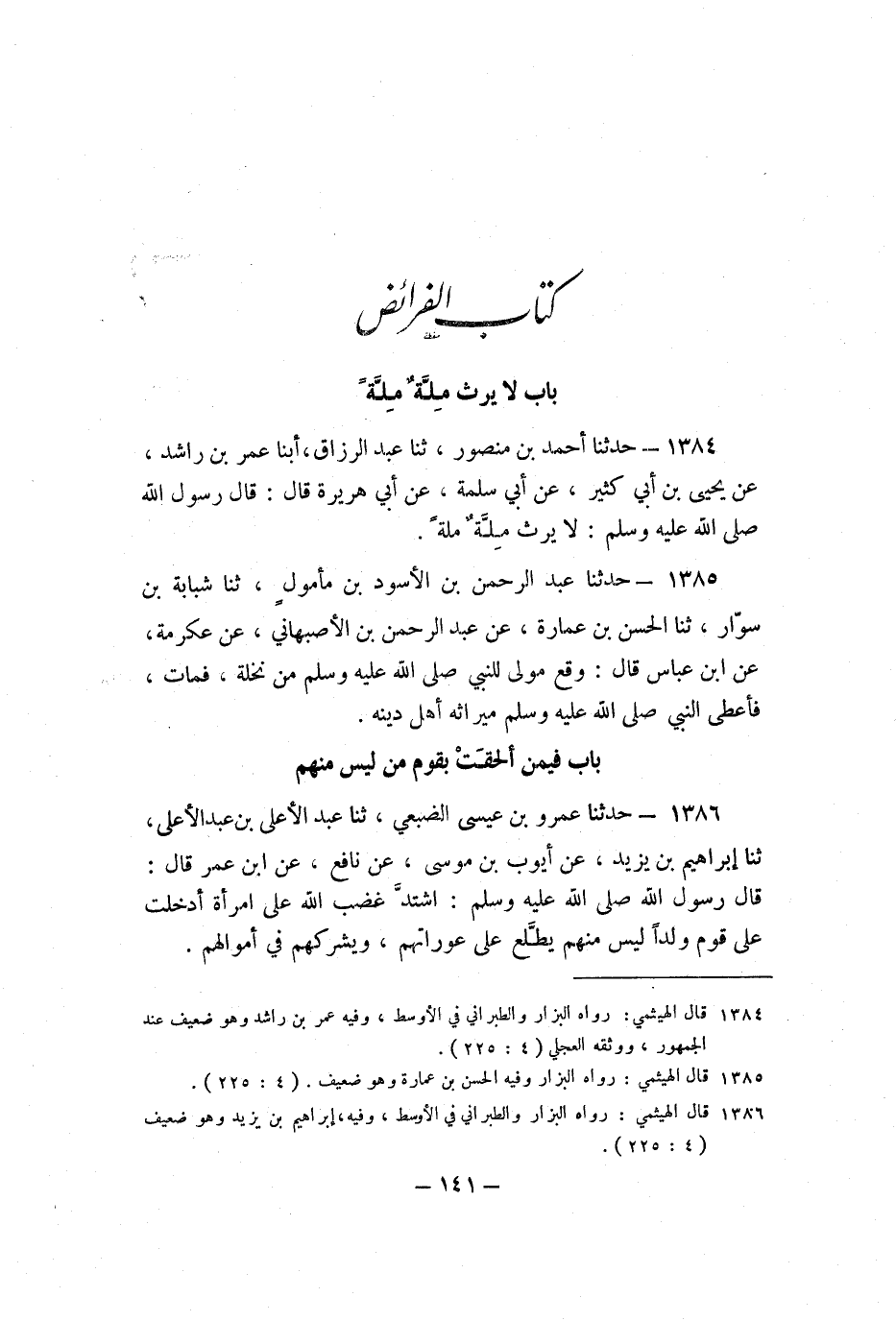1384 - حَدَّثَنَا أَحْمَدُ بْنُ مَنْصُورٍ، ثنا عَبْدُ الرَّزَّاقِ، أنبا عُمَرُ بْنُ رَاشِدٍ، عَنْ يَحْيَى بْنِ أَبِي كَثِيرٍ، عَنْ أَبِي سَلَمَةَ، عَنْ أَبِي هُرَيْرَةَ، قَالَ: قَالَ رَسُولُ اللَّهِ صَلَّى اللَّهُ عَلَيْهِ وَسَلَّمَ: «لا يَرِثُ مِلَّةٌ مِلَّةً» .