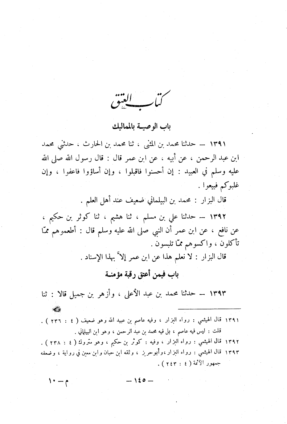 1391 - حَدَّثَنَا مُحَمَّدُ بْنُ الْمُثَنَّى، ثنا مُحَمَّدُ بْنُ الْحَارِثِ، حَدَّثَنِي مُحَمَّدُ بْنُ عَبْدِ الرَّحْمَنِ، عَنْ أَبِيهِ، عَنِ ابْنِ عُمَرَ، قَالَ: قَالَ رَسُولُ اللَّهِ صَلَّى اللَّهُ عَلَيْهِ وَسَلَّمَ فِي الْعَبِيدِ: «إِنْ أَحْسَنُوا فَاقْبَلُوا، وَإِنْ أَسَاءُوا فَاعْفُوا، وَإِنْ غَلَبُوكُمْ فَبِيعُوا» .