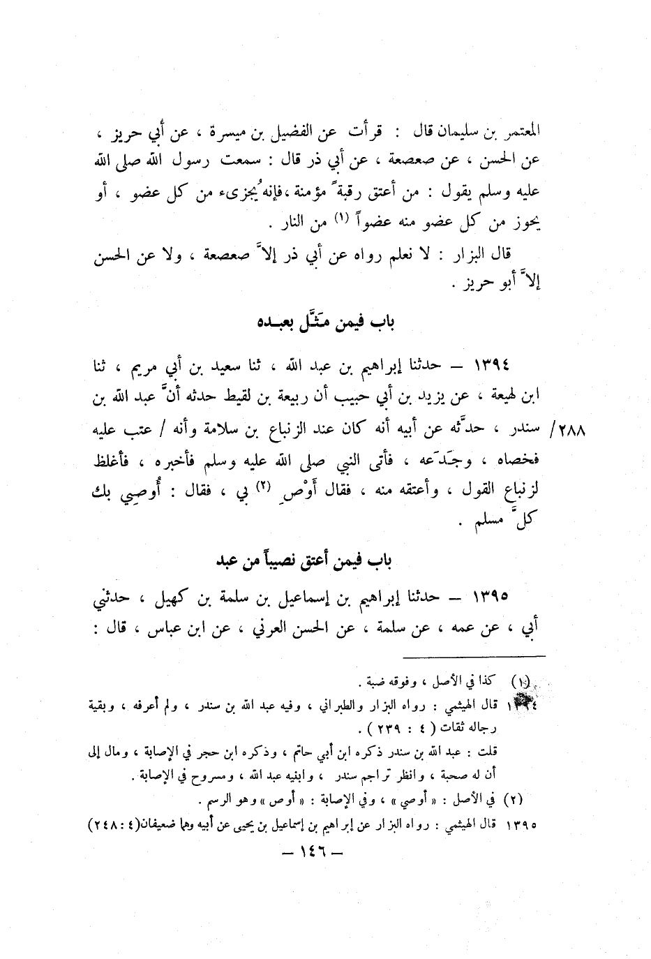 1394 - حَدَّثَنَا إِبْرَاهِيمُ بْنُ عَبْدِ اللَّهِ، ثنا سَعِيدُ بْنُ أَبِي مَرْيَمَ، ثنا ابْنُ لَهِيعَةَ، عَنْ يَزِيدَ بْنِ أَبِي حَبِيبٍ، أَنَّ رَبِيعَةَ بْنَ لَقِيطٍ حَدَّثَهُ، أَنَّ عَبْدَ اللَّهِ بْنَ سَنْدَرٍ حَدَّثَهُ عَنْ أَبِيهِ، أَنَّهُ كَانَ عِنْدَ الزِّنْبَاعِ بْنِ سَلامَةَ، وَأَنَّهُ عَتَبَ عَلَيْهِ فَخَصَاهُ، وَجَدَعَهُ، فَأَتَى النَّبِيَّ صَلَّى اللَّهُ عَلَيْهِ وَسَلَّمَ فَأَخْبَرَهُ، فَأَغْلَظَ لِزِنْبَاعٍ الْقَوْلَ، وَأَعْتَقَهُ مِنْهُ، فَقَالَ: أَوْصِ بِي، فَقَالَ: «أُوصِي بِكَ كُلَّ مُسْلِمٍ» .