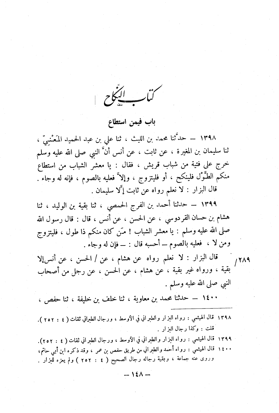 1399 - حَدَّثَنَا أَحْمَدُ بْنُ الْفَرَجِ الْحِمْصِيُّ، ثنا بَقِيَّةُ بْنُ الْوَلِيدِ، ثنا هِشَامُ بْنُ حَسَّانٍ الْقُرْدُوسِيُّ، عَنِ الْحَسَنِ، عَنْ أنَسٍ، قَالَ: قَالَ رَسُولُ اللَّهِ صَلَّى اللَّهُ عَلَيْهِ وَسَلَّمَ: " يَا مَعْشَرَ الشَّبَابِ، مَنْ كَانَ مِنْكُمْ ذَا طَوْلٍ، فَلْيَتَزَوَّجْ، وَمَنْ لا فَعَلَيْهِ بِالصَّوْمِ، أَحْسِبُهُ قَالَ: فَإِنَّ لَهُ وِجَاءً ".