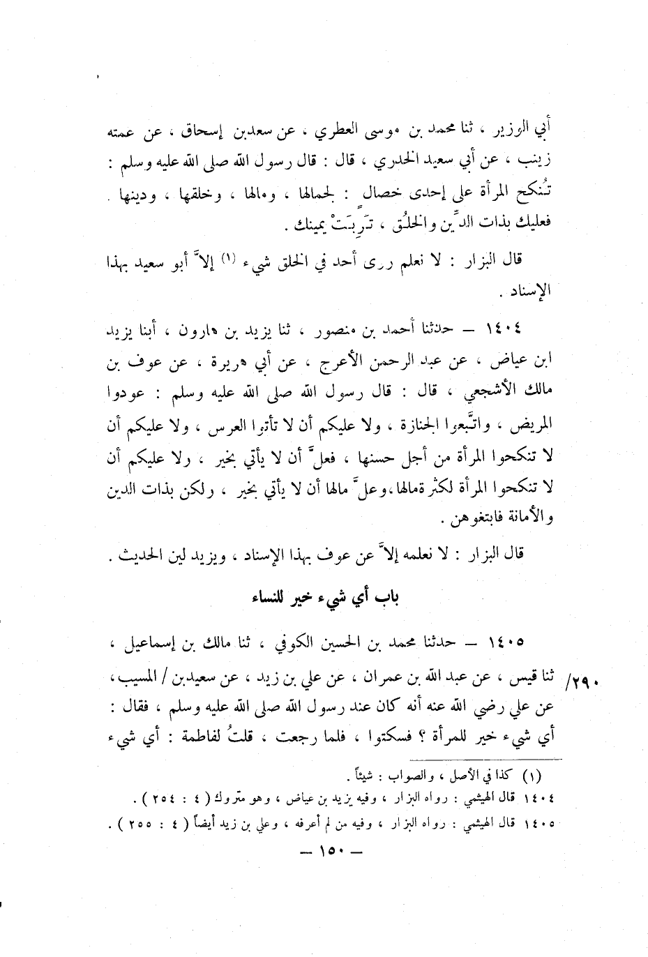 1405 - حَدَّثَنَا مُحَمَّدُ بْنُ الْحُسَيْنِ الْكُوفِيُّ، ثنا مَالِكُ بْنُ إِسْمَاعِيلَ، ثنا قَيْسٌ، عَنْ عَبْدِ اللَّهِ بْنِ عِمْرَانَ، عَنْ عَلِيِّ بْنِ زَيْدٍ، عَنْ سَعِيدِ بْنِ الْمُسَيِّبِ، عَنْ عَلِيٍّ رَضِيَ اللَّهُ عَنْهُ، أَنَّهُ كَانَ عِنْدَ رَسُولِ اللَّهِ صَلَّى اللَّهُ عَلَيْهِ وَسَلَّمَ، فَقَالَ: «أَيُّ شَيْءٍ خَيْرٌ لِلْمَرْأَةِ؟» فَسَكَتُوا، فَلَمَّا رَجَعْتُ، قُلْتُ لِفَاطِمَةَ: أَيُّ شَيْءٍ