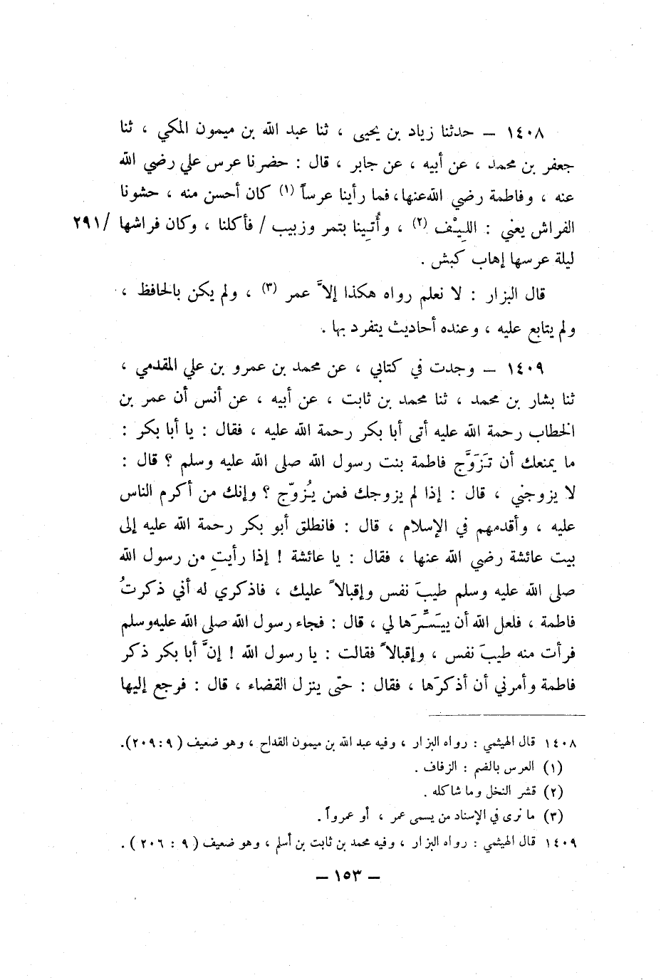 1408 - حَدَّثَنَا زِيَادُ بْنُ يَحْيَى، ثنا عَبْدُ اللَّهِ بْنُ مَيْمُونٍ الْمَكِّيُّ، ثنا جَعْفَرُ بْنُ مُحَمَّدٍ، عَنْ أَبِيهِ، عَنْ جَابِرٍ، قَالَ: حَضَرْنَا عُرْسَ عَلِيٍّ رَضِيَ اللَّهُ عَنْهُ، وَفَاطِمَةَ رَضِيَ اللَّهُ عَنْهَا، فَمَا رَأَيْنَا عُرْسًا كَانَ أَحْسَن مِنْهُ، حَشَوْنَا الْفِرَاشَ، يَعْنِي: اللَّيْفَ، وَأُتِينَا بِتَمْرٍ وَزَبِيبٍ فَأَكَلْنَا، وَكَانَ فِرَاشُهَا لَيْلَةَ عُرْسِهَا إِهَابَ كَبْشٍ.