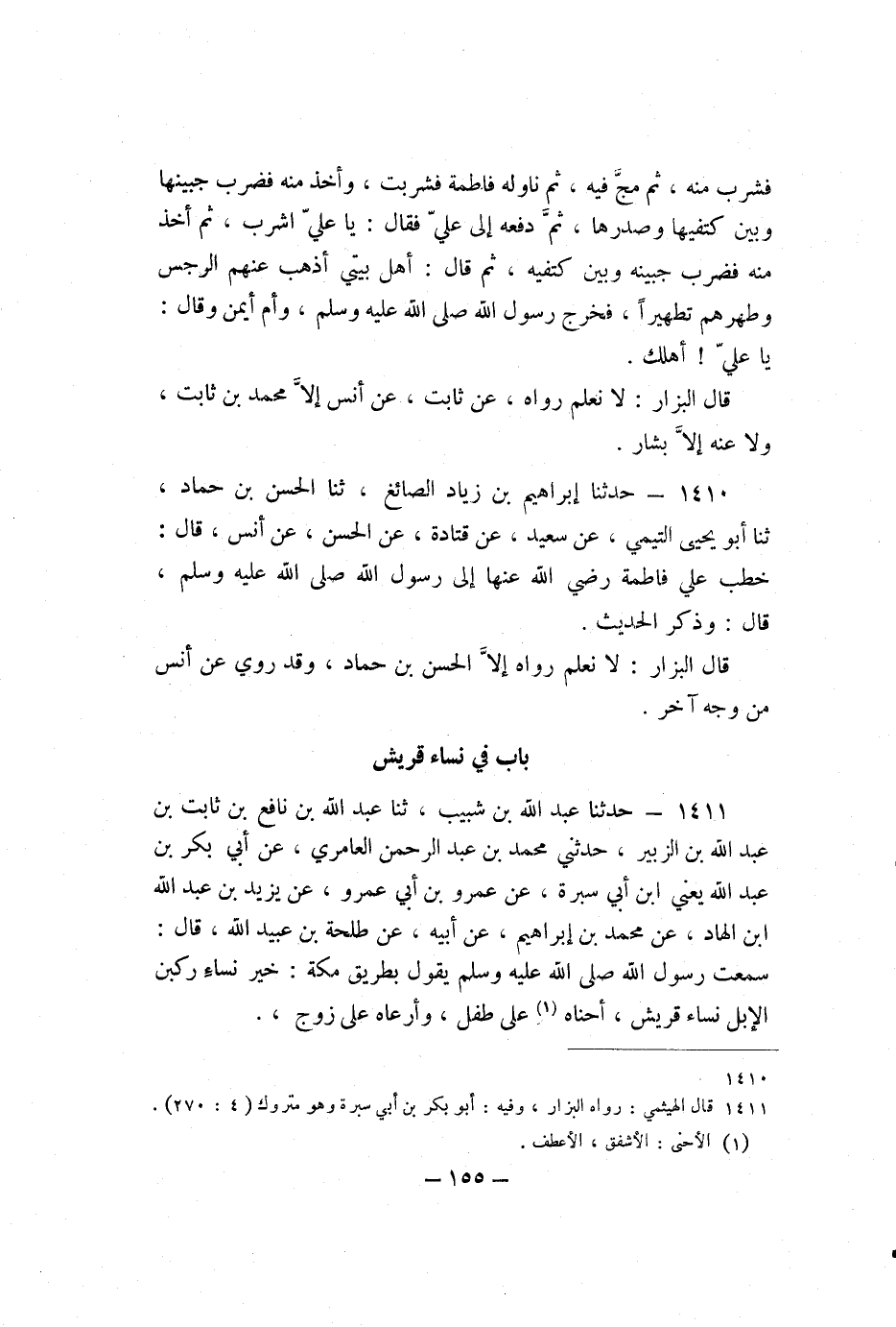 1411 - حَدَّثَنَا عَبْدُ اللَّهِ بْنُ شَبِيبٍ، ثنا عَبْدُ اللَّهِ بْنُ نَافِعِ بْنِ ثَابِتِ بْنِ عَبْدِ اللَّهِ بْنِ الزُّبَيْرِ، حَدَّثَنِي مُحَمَّدُ بْنُ عَبْدِ الرَّحْمَنِ الْعَامِرِيُّ، عَنْ أَبِي بَكْرِ بْنِ عَبْدِ اللَّهِ، يَعْنِي: ابْنَ أَبِي سَبْرَةَ، عَنْ عَمْرِو بْنِ أَبِي عَمْرٍو، عَنْ يَزِيدَ بْنِ عَبْدِ اللَّهِ بْنِ الْهَادِ، عَنْ مُحَمَّدِ بْنِ إِبْرَاهِيمَ، عَنْ أَبِيهِ، عَنْ طَلْحَةَ بْنِ عُبَيْدِ اللَّهِ، قَالَ: سَمِعْتُ رَسُولَ اللَّهِ صَلَّى اللَّهُ عَلَيْهِ وَسَلَّمَ يَقُولُ بِطَرِيقِ مَكَّةَ: «خَيْرُ نِسَاءٍ رَكِبْنَ الإِبِلَ نِسَاءُ قُرَيْشٍ، أَحْنَاهُ عَلَى طِفْلٍ، وَأَرْعَاهُ عَلَى زَوْجٍ» .