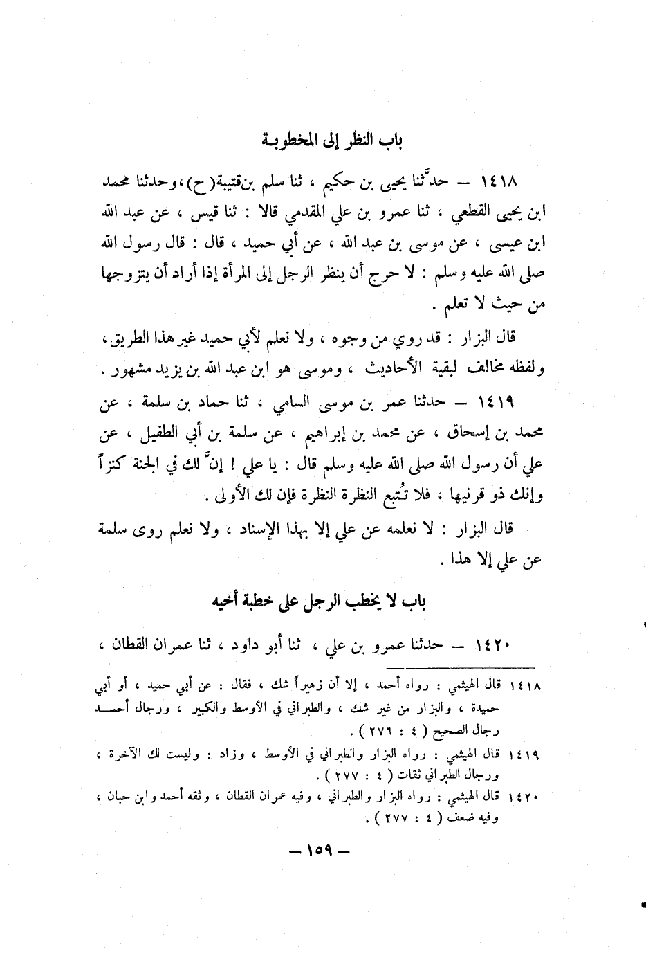 1418 - حَدَّثَنَا يَحْيَى بْنُ حَكِيمٍ، ثنا سَلْمُ بْنُ قُتَيْبَةَ (ح) ، وَحَدَّثَنَا مُحَمَّدُ بْنُ يَحْيَى الْقُطَعِيُّ، ثنا عَمْرُ بْنُ عَلِيٍّ الْمُقَدَّمِيُّ، قَالا: ثنا قَيْسٌ، عَنْ عَبْدِ اللَّهِ بْنِ عِيسَى، عَنْ مُوسَى بْنِ عَبْدِ اللَّهِ، عَنْ أَبِي حُمَيْدٍ، قَالَ: قَالَ رَسُولُ اللَّهِ صَلَّى اللَّهُ عَلَيْهِ وَسَلَّمَ: «لا حَرَجَ أَنْ يَنْظُرَ الرَّجُلُ إِلَى الْمَرْأَةِ إِذَا أَرَادَ أَنْ يَتَزَوَّجَهَا مِنْ حَيْثُ لا تَعْلَمُ» .