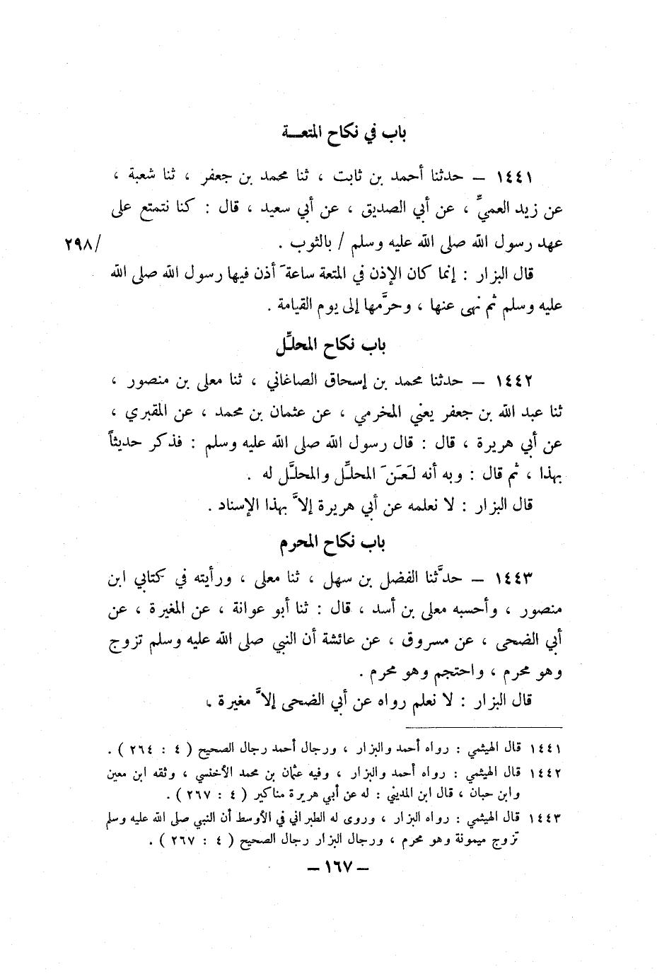 قَالَ الْبَزَّارُ: إِنَّمَا كَانَ الإِذْنُ فِي الْمُتْعَةِ سَاعَةَ أَذِنَ فِيهَا رَسُولُ اللَّهِ صَلَّى اللَّهُ عَلَيْهِ وَسَلَّمَ ثُمَّ نَهَى عَنْهَا، وَحَرَّمَهَا إِلَى يَوْمِ الْقِيَامَةِ.
