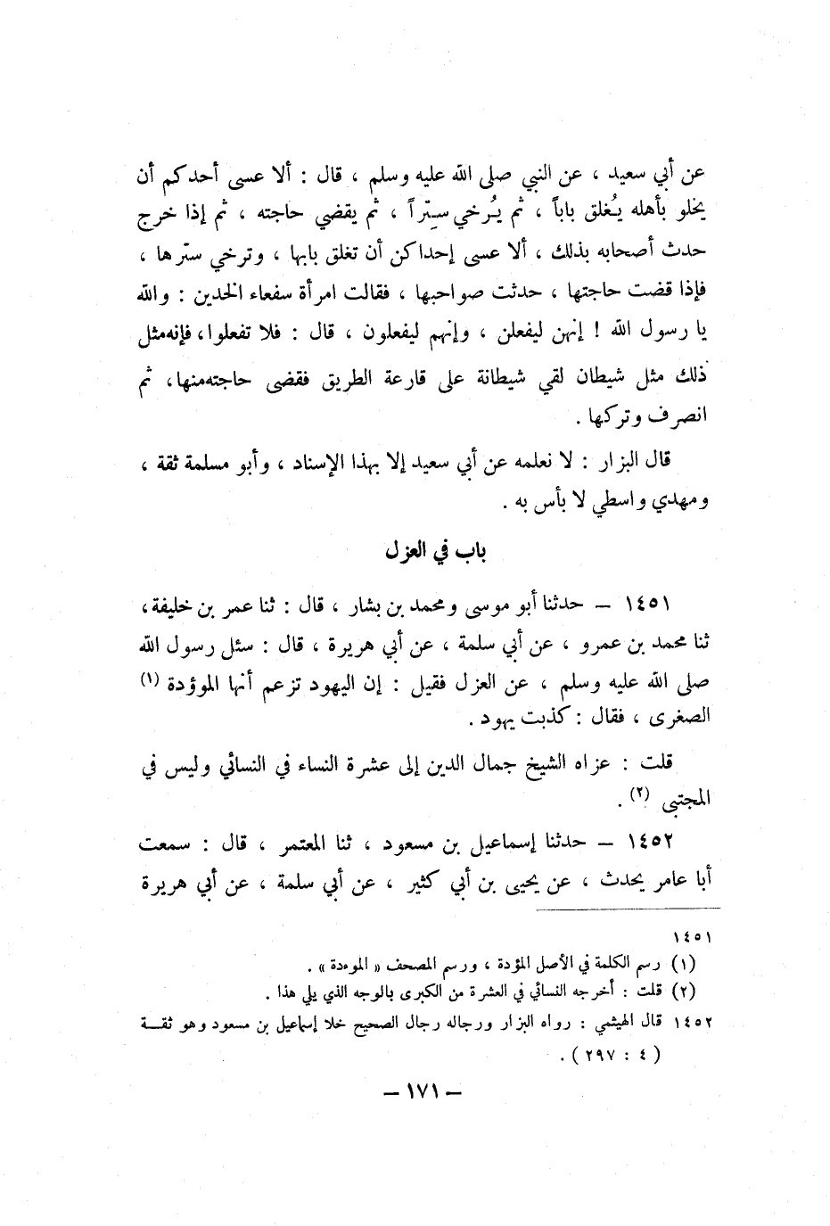 1451 - حَدَّثَنَا أَبُو مُوسَى، وَمُحَمَّدُ بْنُ بَشَّارٍ، قَالَ: ثنا عُمَرُ بْنُ خَلِيفَةَ، ثنا مُحَمَّدُ بْنُ عَمْرٍو، عَنْ أَبِي سَلَمَةَ، عَنْ أَبِي هُرَيْرَةَ، قَالَ: سُئِلَ رَسُولُ اللَّهِ صَلَّى اللَّهُ عَلَيْهِ وَسَلَّمَ، عَنِ الْعَزْلِ، فَقِيلَ: إِنَّ الْيَهُودَ تَزْعُمُ أَنَّهَا الْمَوْءُدَةُ الصُّغْرَى، فَقَالَ: «كَذَبَتْ يَهُودُ» .