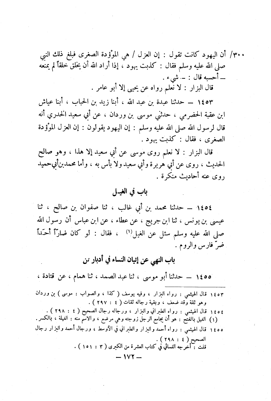 1453 - حَدَّثَنَا عَبْدَةُ بْنُ عَبْدِ اللَّهِ، أبنا زَيْدُ بْنُ الْحُبَابِ، أبنا عَيَّاشُ بْنُ عُقْبَةَ الْحَضْرَمِيُّ، حَدَّثَنِي مُوسَى بْنُ وَرْدَانَ، عَنْ أَبِي سَعِيدٍ الْخُدْرِيِّ، أَنَّهُ قَالَ لِرَسُولِ اللَّه صَلَّى اللَّهُ عَلَيْهِ وَسَلَّمَ: إِنَّ الْيَهُودَ يَقُولُونَ: إِنَّ الْعَزْلَ الْمَوْءُدَةُ الصُّغْرَى، فَقَالَ: «كَذَبَتْ يَهُودُ» .