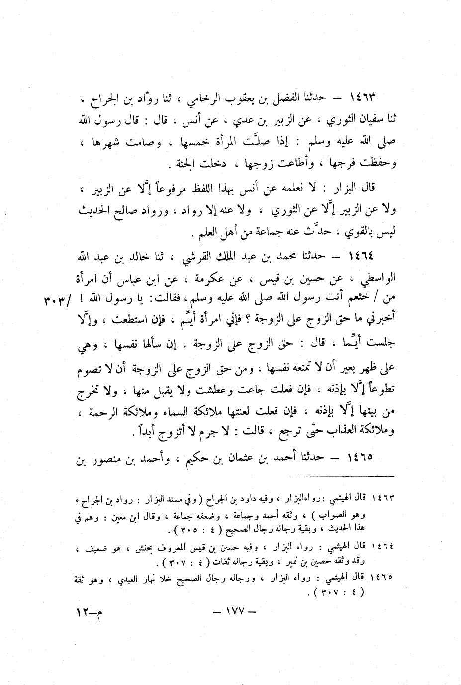 قَالَ الْبَزَّارُ: لا نَعْلَمُهُ عَنْ أَنَسٍ بِهَذَا اللَّفْظِ مَرْفُوعًا إِلا عَنِ الزُّبَيْرِ، وَلا عَنِ الزُّبَيْرِ إِلا عَنِ الثَّوْرِيِّ، وَلا عَنْهُ إِلا رَوَّادٌ، وَرَوَّادٌ صَالِحُ الْحَدِيثِ لَيْسَ بِالْقَوِيِّ، حَدَّثَ عَنْهُ جَمَاعَةٌ مِنْ أَهْلِ الْعِلْمِ.