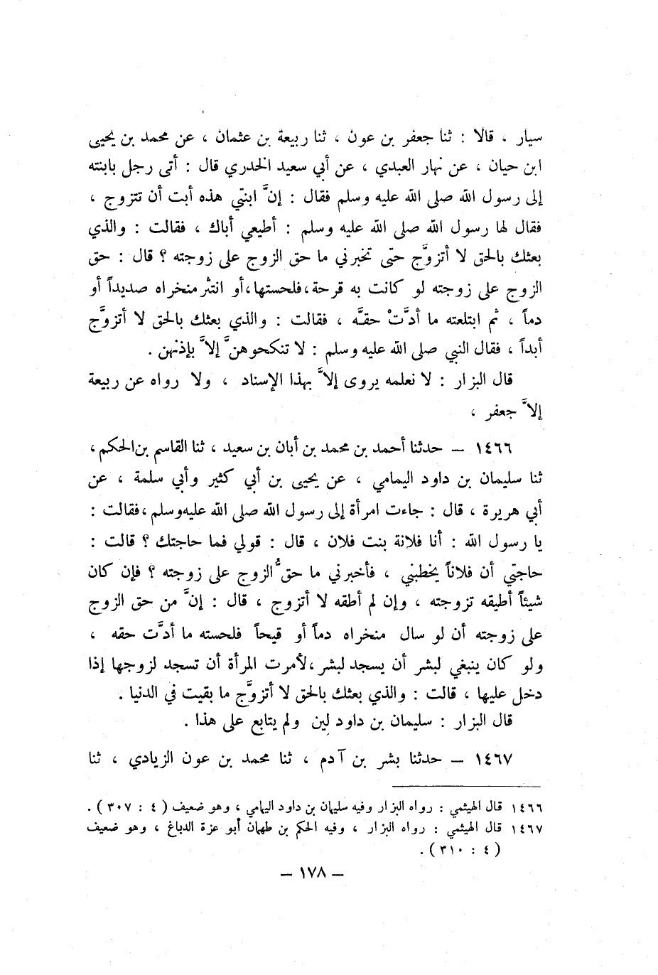 سَيَّارٍ، قَالا: ثنا جَعْفَرُ بْنُ عَوْنٍ، ثنا رَبِيعَةُ بْنُ عُثْمَانَ، عَنْ مُحَمَّدِ بْنِ يَحْيَى بْنِ حَيَّانَ، عَنْ نَهَارٍ الْعَبْدِيِّ، عَنْ أَبِي سَعِيدٍ الْخُدْرِيِّ، قَالَ: أَتَى رَجُلٌ بِابْنَتِهِ إِلَى رَسُولِ اللَّهِ صَلَّى اللَّهُ عَلَيْهِ وَسَلَّمَ، فَقَالَ: إِنَّ ابْنَتِي هَذِهِ أَبَتْ أَنْ تَتَزَوَّجَ، فَقَالَ لَهَا رَسُولُ اللَّهِ صَلَّى اللَّهُ عَلَيْهِ وَسَلَّمَ: «أَطِيعِي أَبَاكِ» ، فَقَالَتْ: وَالَّذِي بَعَثَكَ بِالْحَقِّ، لا أَتَزَوَّجُ حَتَّى تُخْبِرَنِي مَا حَقُّ الزَّوْجِ عَلَى زَوْجَتِهِ؟ قَالَ: «حَقُّ الزَّوْجِ عَلَى زَوْجَتِهِ لَوْ كَانَتْ بِهِ قُرْحَةٌ فَلَحِسَتْهَا، أَوِ انْتَثَرَ مَنْخِرَاهُ صَدِيدًا أَوْ دَمًا، ثُمَّ ابْتَلَعَتْهُ مَا أَدَّتْ حَقَّهُ» ، فَقَالَتْ: وَالَّذِي بَعَثَكَ بِالْحَقِّ، لا أَتَزَوَّجُ أَبَدًا، فَقَالَ النَّبِيُّ صَلَّى اللَّهُ عَلَيْهِ وَسَلَّمَ: «لا تُنْكِحُوهُنَّ إِلا بِإِذْنِهِنَّ» .