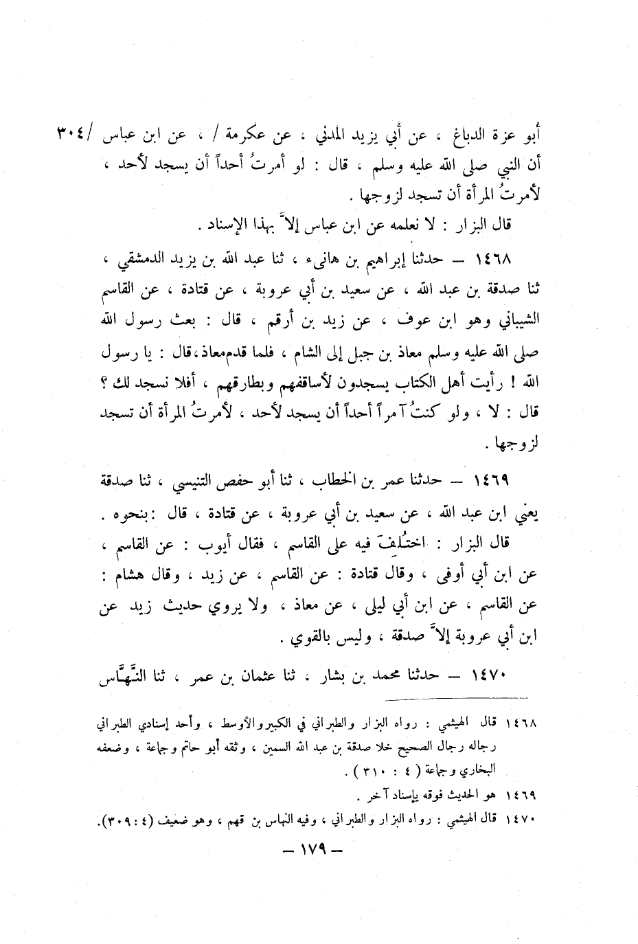 1468 - حَدَّثَنَا إِبْرَاهِيمُ بْنُ هَانِئٍ، ثنا عَبْدُ اللَّهِ بْنُ يَزِيدَ الدِّمَشْقِيُّ، ثنا صَدَقَةُ بْنُ عَبْدِ اللَّهِ، عَنْ سَعِيدِ بْنِ أَبِي عَرُوبَةَ، عَنْ قَتَادَةَ، عَنِ الْقَاسِمِ الشَّيْبَانِيِّ، وَهُوَ ابْن عَوْفٍ، عَنْ زَيْدِ بْنِ أَرْقَمَ، قَالَ: بَعَثَ رَسُولُ اللَّهِ صَلَّى اللَّهُ عَلَيْهِ وَسَلَّمَ مُعَاذَ بْنَ جَبَلٍ إِلَى الشَّامِ، فَلَمَّا قَدِمَ مُعَاذٌ، قَالَ: يَا رَسُولَ اللَّهِ، رَأَيْتُ أَهْلَ الْكِتَابِ يَسْجُدُونَ لأَسَاقِفِهِمْ وَبَطَارِقِهِمْ، أَفَلا نَسْجُدُ لَكَ؟ قَالَ: «لا، وَلَوْ كُنْتُ آمِرًا أَحَدًا أَنْ يَسْجُدَ لأَحَدٍ، لأَمَرْتُ الْمَرْأَةَ أَنْ تَسْجُدَ لِزَوْجِهَا» .
