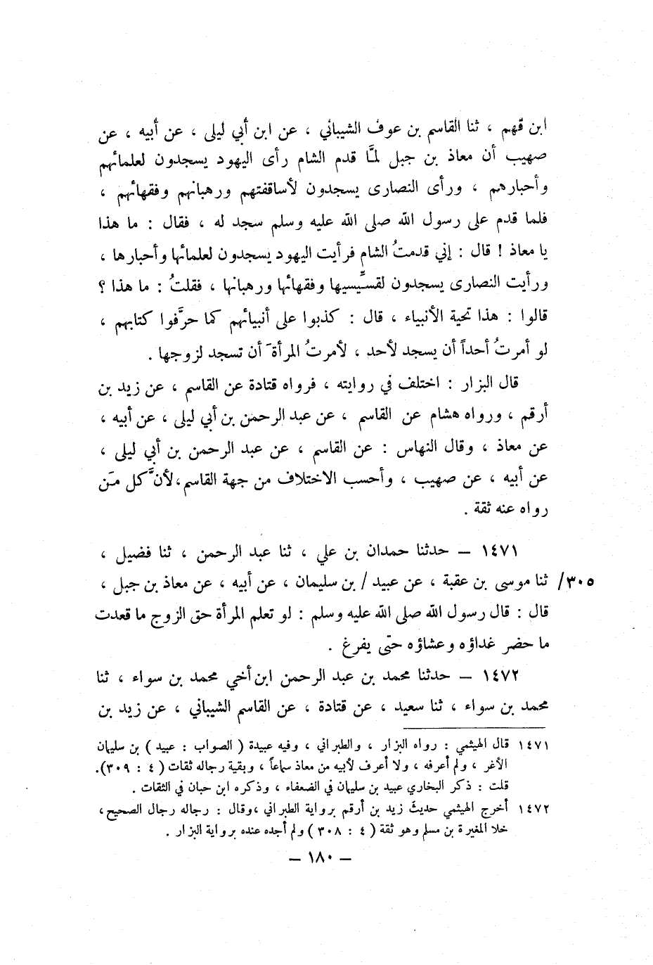 بْنُ قَهْمٍ، ثنا الْقَاسِمُ بْنُ عَوْفٍ الشَّيْبَانِيُّ، عَنِ ابْنِ أَبِي لَيْلَى، عَنْ أَبِيهِ، عَنْ صُهَيْبٍ، أَنَّ مُعَاذَ بْنَ جَبَلٍ لَمَّا قَدِمَ الشَّامَ رَأَى الْيَهُودَ يَسْجُدُونَ لِعُلَمَائِهِمْ وَأَحْبَارِهِمْ، وَرَأَى النَّصَارَى يَسْجُدُونَ لأَسَاقِفَتِهِمْ وَرُهْبَانِهِمْ وَفُقَهَائِهِمْ، فَلَمَّا قَدِمَ عَلَى رَسُولِ اللَّهِ صَلَّى اللَّهُ عَلَيْهِ وَسَلَّمَ سَجَدَ لَهُ، فَقَالَ: «مَا هَذَا يَا مُعَاذُ؟» قَالَ: إِنِّي قَدِمْتُ الشَّامَ فَرَأَيْتُ الْيَهُودَ يَسْجُدُونَ لِعُلَمَائِهَا وَأَحْبَارِهَا، وَرَأَيْتُ النَّصَارَى يَسْجُدُونَ لِقِسِّيسِيهَا وَفُقَهَائِهَا وَرُهْبَانِهَا، فَقُلْتُ: مَا هَذَا؟ قَالُوا: هَذَا تَحِيَّةُ الأَنْبِيَاءِ، قَالَ: «كَذَبُوا عَلَى أَنْبِيَائِهِمْ كَمَا حَرَّفُوا كِتَابَهُمْ، لَوْ أَمَرْتُ أَحَدًا أَنْ يَسْجُدَ لأَحَدٍ، لأَمَرْتُ الْمَرْأَةَ أَنْ تَسْجُدَ لِزَوْجِهَا» .