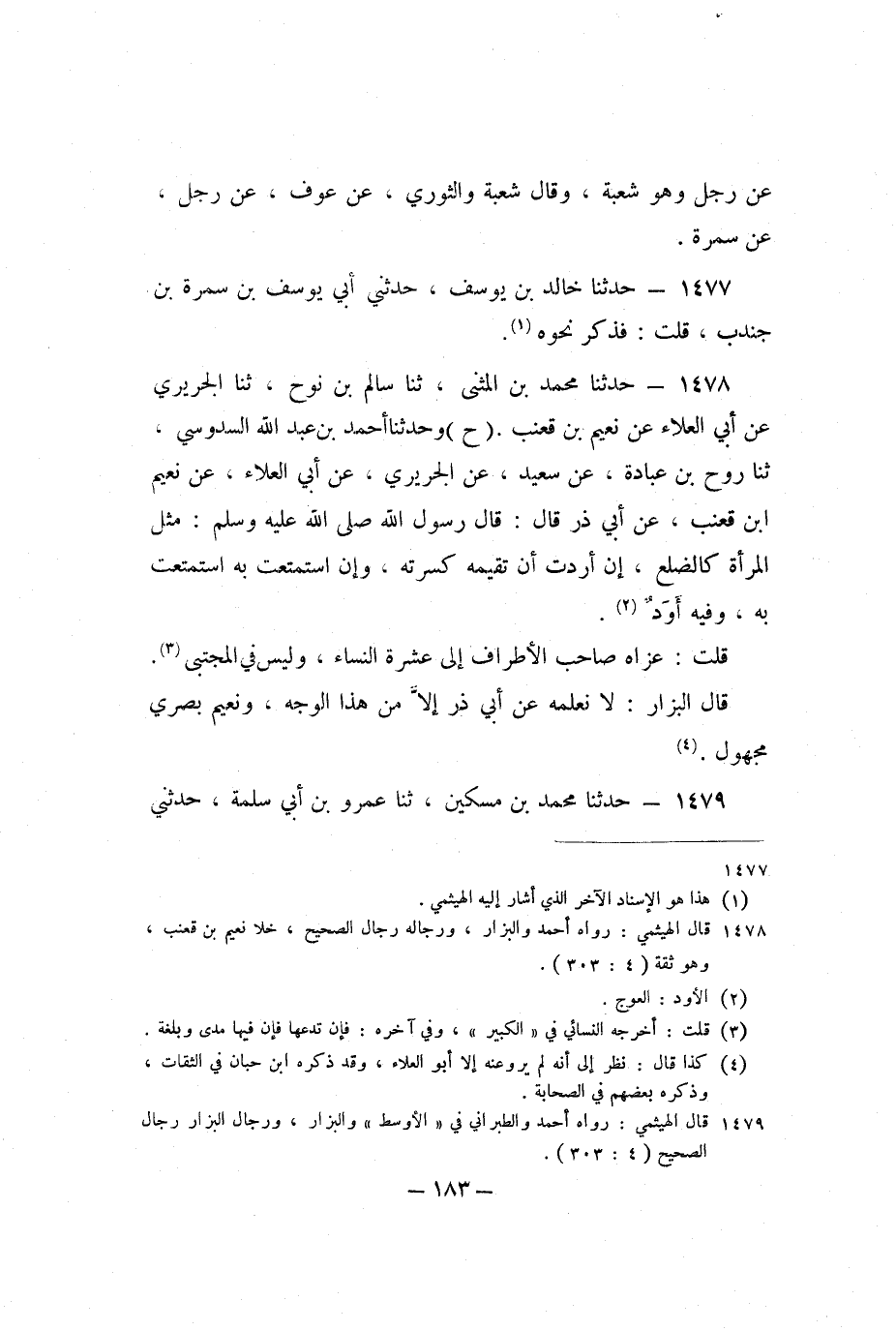 1478 - حَدَّثَنَا مُحَمَّدُ بْنُ الْمُثَنَّى، ثنا سَالِمُ بْنُ نُوحٍ، ثنا الْجُرَيْرِيُّ، عَنْ أَبِي الْعَلاءِ، عَنْ نُعَيْمِ بْنِ قَعْنَبٍ (ح) ، وَحَدَّثَنَا أَحْمَدُ بْنُ عَبْدِ اللَّهِ السَّدُوسِيُّ، ثنا رَوْحُ بْنُ عُبَادَةَ، عَنْ سَعِيدٍ، عَنِ الْجُرَيْرِيِّ، عَنْ أَبِي الْعَلاءِ، عَنْ نُعَيْمِ بْنِ قَعْنَبٍ، عَنْ أَبِي ذَرٍّ، قَالَ: قَالَ رَسُولُ اللَّهِ صَلَّى اللَّهُ عَلَيْهِ وَسَلَّمَ: «مَثَلُ الْمَرْأَةِ كَالضِّلْعِ، إِنْ أَرَدْتَ أَنْ تُقِيمَهُ كَسَرْتَهُ، وَإِنِ اسْتَمْتَعْتَ بِهِ اسْتَمْتَعْتَ بِهِ، وَفِيهِ أَوَدٌ» .