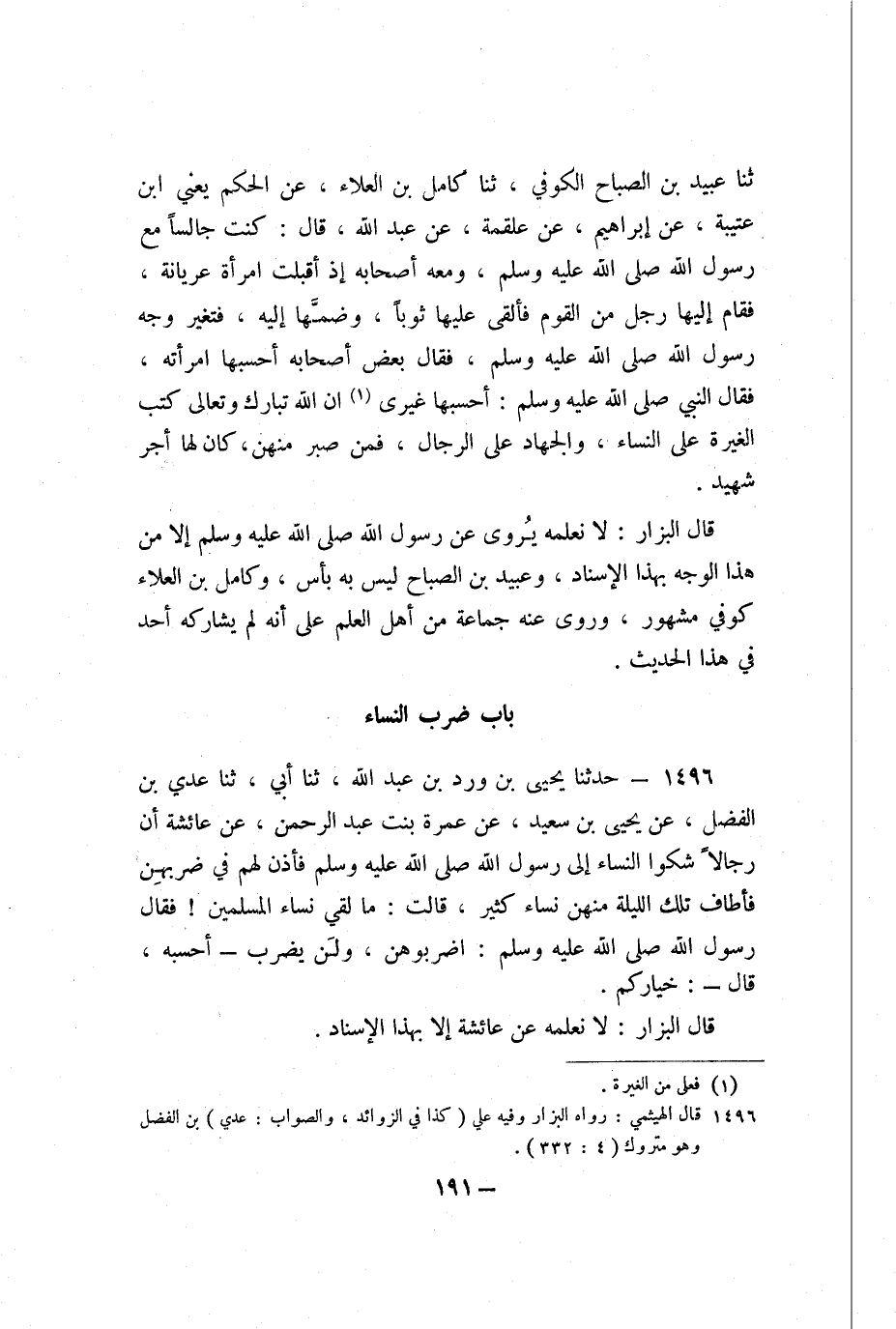 1496 - حَدَّثَنَا يَحْيَى بْنُ وَرَدَ بْنِ عَبْدِ اللَّهِ، ثنا أَبِي، ثنا عَدِيُّ بْنُ الْفَضْلِ، عَنْ يَحْيَى بْنِ سَعِيدٍ، عَنْ عَمْرَةَ بِنْتِ عَبْدِ الرَّحْمَنِ، عَنْ عَائِشَةَ، أَنَّ رِجَالا شَكَوُا النِّسَاءَ إِلَى رَسُولِ اللَّهِ صَلَّى اللَّهُ عَلَيْهِ وَسَلَّمَ فَأَذِنَ لَهُمْ فِي ضَرْبِهِنَّ، فَأَطَافَ تِلْكَ اللَّيْلَةَ مِنْهُنَّ نِسَاءٌ كَثِيرٌ، قَالَتْ: مَا لَقِيَ نِسَاءُ الْمُسْلِمِينَ، فَقَالَ رَسُولُ اللَّهِ صَلَّى اللَّهُ عَلَيْهِ وَسَلَّمَ: " اضْرِبُوهُنَّ، وَلَنْ يَضْرِبَ، أَحْسِبُهُ قَالَ: خِيَارُكُمْ ".
