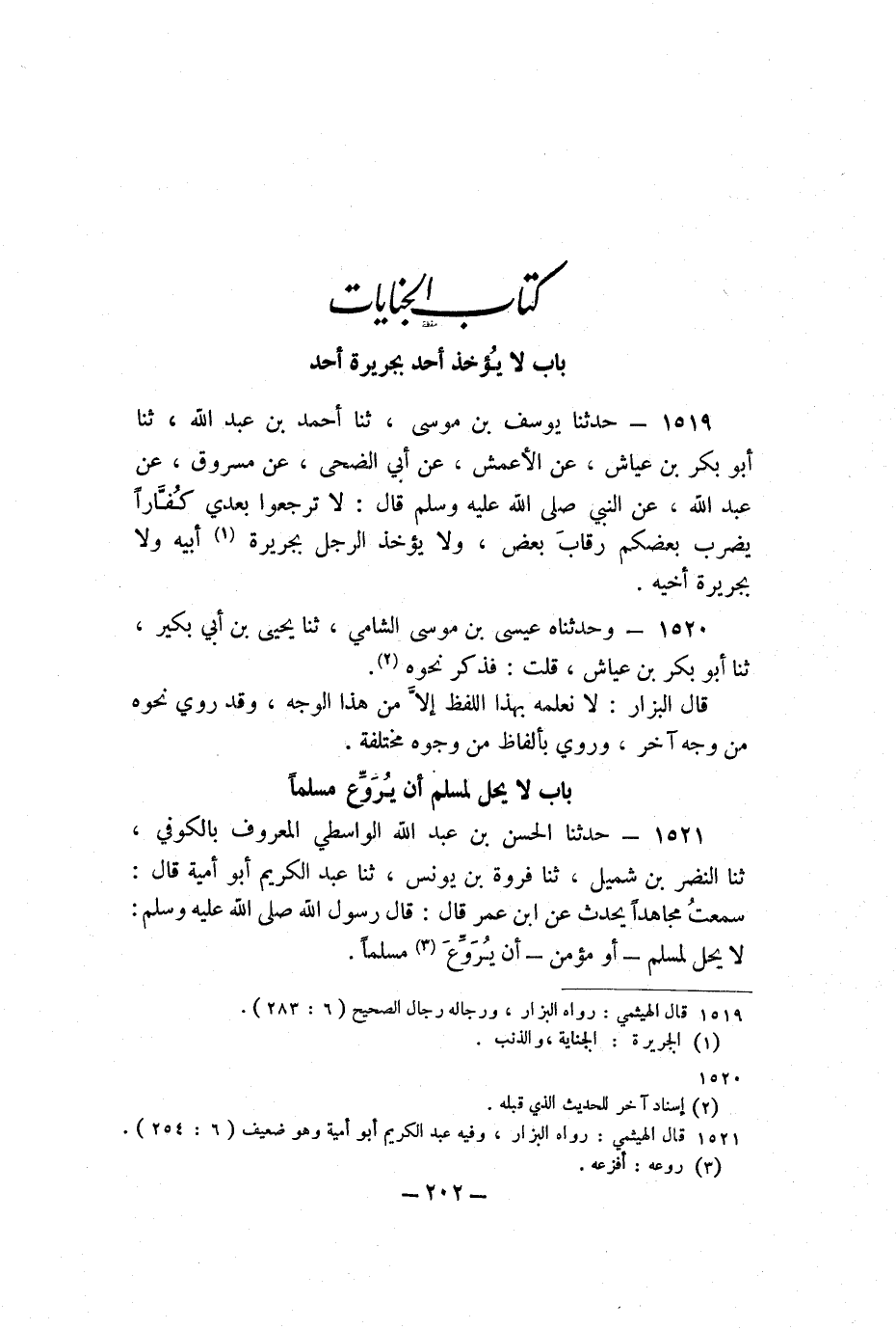 1519 - حَدَّثَنَا يُوسُفُ بْنُ مُوسَى، ثنا أَحْمَدُ بْنُ عَبْدِ اللَّهِ، ثنا أَبُو بَكْرِ بْنُ عَيَّاشٍ، عَنِ الأَعْمَشِ، عَنْ أَبِي الضُّحَى، عَنْ مَسْرُوقٍ، عَنْ عَبْدِ اللَّهِ، عَنِ النَّبِيِّ صَلَّى اللَّهُ عَلَيْهِ وَسَلَّمَ، قَالَ: «لا تَرْجِعُوا بَعْدِي كُفَّارًا يَضْرِبُ بَعْضُكُمْ رِقَابَ بَعْضٍ، وَلا يُؤْخَذُ الرَّجُلُ بِجَرِيرَةِ أَبِيهِ، وَلا بِجَرِيرَةِ أَخِيهِ» .