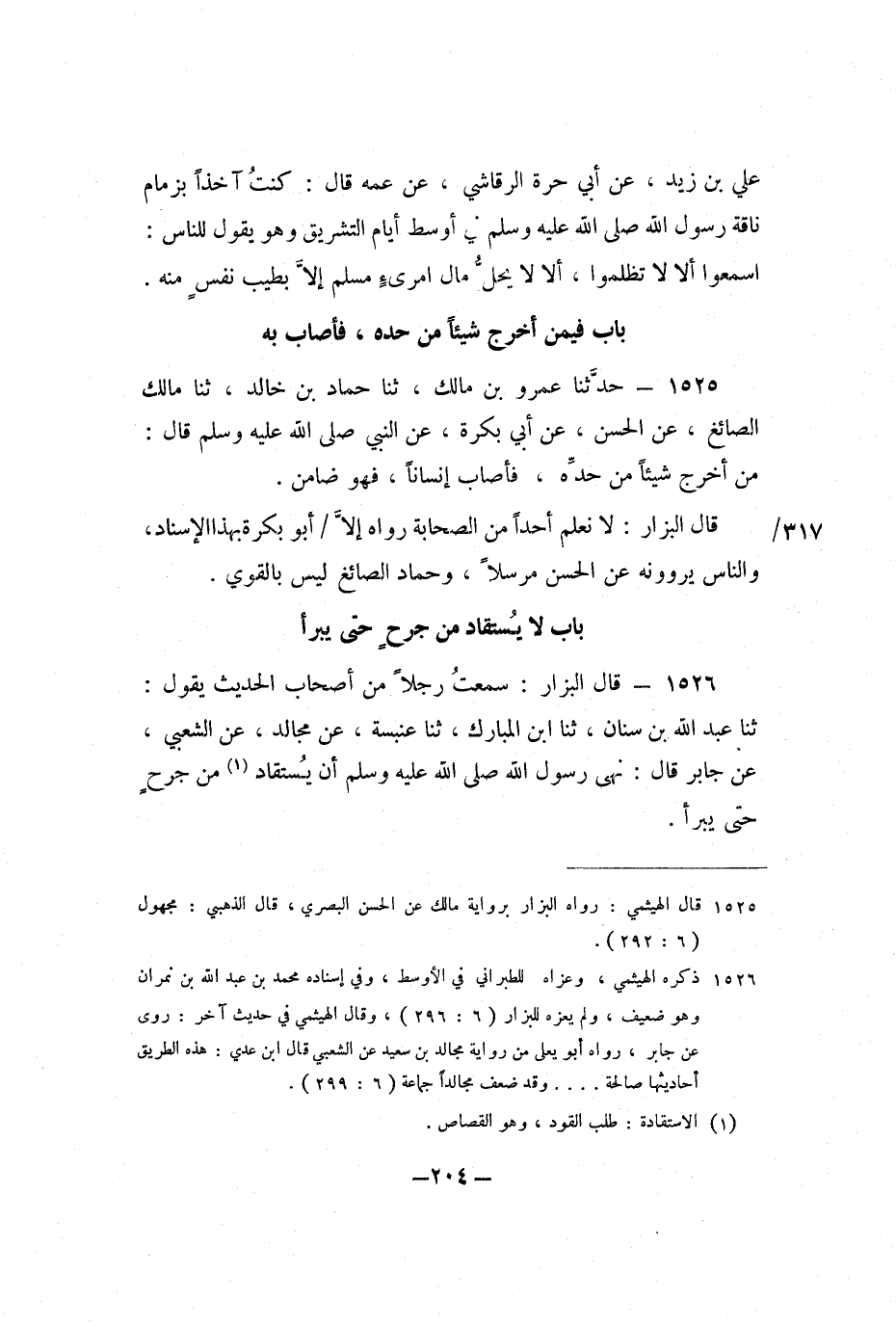 1526 - قَالَ الْبَزَّارُ: سَمِعْتُ رَجُلا مِنْ أَصْحَابِ الْحَدِيثِ يَقُولُ: ثنا عَبْدُ اللَّهِ بْنُ سِنَانٍ، ثنا ابْنُ الْمُبَارَكِ، ثنا عَنْبَسَةُ، عَنْ مُجَالِدٍ، عَنِ الشَّعْبِيِّ، عَنْ جَابِرٍ، قَالَ: نَهَى رَسُولُ اللَّهِ صَلَّى اللَّهُ عَلَيْهِ وَسَلَّمَ أَنْ يُسْتَقَادَ مِنْ جُرْحٍ حَتَّى يَبْرَأَ.