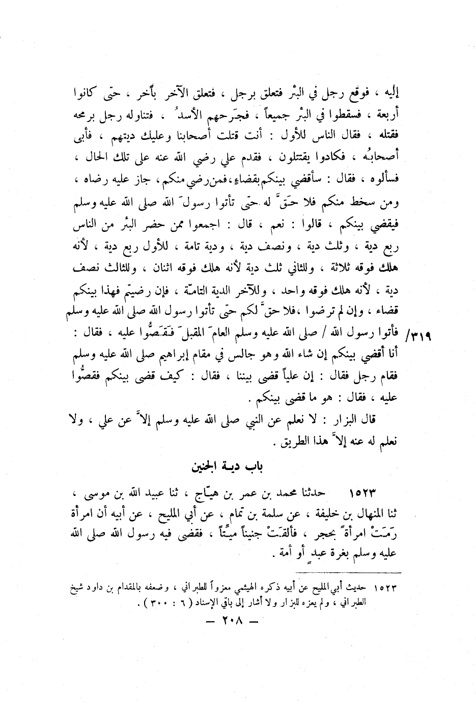 إِلَيْهِ، فَوَقَعَ رَجُلٌ فِي الْبِئْرِ فَتَعَلَّقَ بِرَجُلٍ، فَتَعَلَّقَ الآخَرُ بِآخَرَ، حَتَّى كَانُوا أَرْبَعَةً، فَسَقَطُوا فِي الْبِئْرِ جَمِيعًا، فَجَرَحَهُمُ الأَسَدُ، فَتَنَاوَلَهُ رَجُلٌ بِرُمْحِهِ فَقَتَلَهُ، فَقَالَ النَّاسُ لِلأَوَّلِ: أَنْتَ قَتَلْتَ أَصْحَابَنَا وَعَلَيْكَ دِيَتُهُمْ، فَأَبَى أَصْحَابُهُ، فَكَادُوا يَقْتَتِلُونَ، فَقَدِمَ عَلِيٌّ رَضِيَ اللَّهُ عَنْهُ عَلَى تِلْكَ الْحَالِ، فَسَأَلُوهُ، فَقَالَ: سَأَقْضِي بَيْنَكُمْ بِقَضَاءٍ فَمَنْ رَضِيَ مِنْكُمْ، جَازَ عَلَيْهِ رِضَاهُ، وَمَنْ سَخَطَ مِنْكُمْ فَلا حَقَّ لَهُ حَتَّى تَأْتُوا رَسُولَ اللَّهِ صَلَّى اللَّهُ عَلَيْهِ وَسَلَّمَ فَيَقْضِي بَيْنَكُمْ، قَالُوا: نَعَمْ، قَالَ: اجَمْعُوا مِمَّنْ حَضَرَ الْبِئْرَ مِنَ النَّاسِ رُبْعَ دِيَةٍ، وَثُلُثَ دِيَةٍ، وَنِصْفَ دِيَةٍ، وَدِيَةً تَامَّةً، لِلأَوَّلِ رُبْعُ دِيَةٍ؛ لأَنَّهُ هَلَكَ فَوْقَهُ ثَلاثَةٌ، وَلِلثَّانِي ثُلُثُ دِيَةٍ؛ لأَنَّهُ هَلَكَ فَوْقَهُ اثْنَانِ، وَلِلثَّالِثِ نِصْفُ دِيَةٍ؛ لأَنَّهُ هَلَكَ فَوْقَهُ وَاحِدٌ، وَلِلآخِرِ الدِّيَةُ التَّامَّةُ، فَإِنْ رَضِيتُمْ فَهَذَا بَيْنَكُمْ قَضَاءٌ، وَإِنْ لَمْ تَرْضَوْا، فَلا حَقَّ لَكُمْ حَتَّى تَأْتُوا رَسُولَ اللَّهِ صَلَّى اللَّهُ عَلَيْهِ وَسَلَّمَ، فَأَتَوْا رَسُولَ اللَّهِ صَلَّى اللَّهُ عَلَيْهِ وَسَلَّمَ الْعَامَ الْمُقْبِلَ فَقَصُّوا عَلَيْهِ، فَقَالَ: أَنَا أَقْضِي بَيْنَكُمْ إِنْ شَاءَ اللَّهُ وَهُوَ جَالِسٌ فِي مَقَامِ إِبْرَاهِيمَ صَلَّى اللَّهُ عَلَيْهِ وَسَلَّمَ، فَقَامَ رَجُلٌ فَقَالَ: إِنَّ عَلِيًّا قَضَى بَيْنَنَا، فَقَالَ: «كَيْفَ قَضَى بَيْنَكُمْ؟» فَقَصُّوا عَلَيْهِ، فَقَالَ: «هُوَ مَا قَضَى بَيْنَكُمْ» .