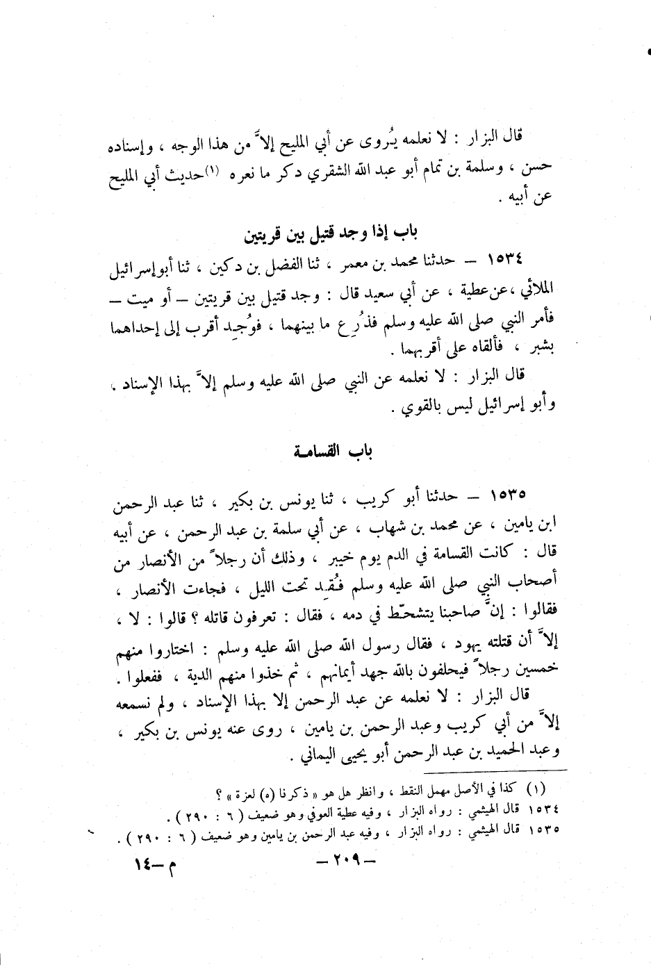 1535 - حَدَّثَنَا أَبُو كُرَيْبٍ، ثنا يُونُسُ بْنُ بُكَيْرٍ، ثنا عَبْدُ الرَّحْمَنِ بْنُ يَامِينَ، عَنْ مُحَمَّدِ بْنِ شِهَابٍ، عَنْ أَبِي سَلَمَةَ بْنِ عَبْدِ الرَّحْمَنِ، عَنْ أَبِيهِ، قَالَ: " كَانَتِ الْقَسَامَةُ فِي الدَّمِ يَوْمَ خَيْبَرَ، وَذَلِكَ أَنَّ رَجُلا مِنَ الأَنْصَارِ مِنْ أَصْحَابِ النَّبِيِّ صَلَّى اللَّهُ عَلَيْهِ وَسَلَّمَ فُقِدَ تَحْتَ اللَّيْلِ، فَجَاءَتِ الأَنْصَارُ، فَقَالُوا: إِنَّ صَاحِبَنَا يَتَشَحَّطُ فِي دَمِهِ، فَقَالَ: «تَعْرِفُونَ قَاتِلَهُ؟» قَالُوا: لا، إِلا أَنْ قَتَلَتْهُ الْيَهُودُ، فَقَالَ رَسُولُ اللَّهِ صَلَّى اللَّهُ عَلَيْهِ وَسَلَّمَ: «اخْتَارُوا مِنْهُمْ خَمْسِينَ رَجُلا فَيَحْلِفُونَ بِاللَّهِ جَهْدَ أَيْمَانِهِمْ، ثُمَّ خُذُوا مِنْهُمُ الدِّيَةَ» ، فَفَعَلُوا.