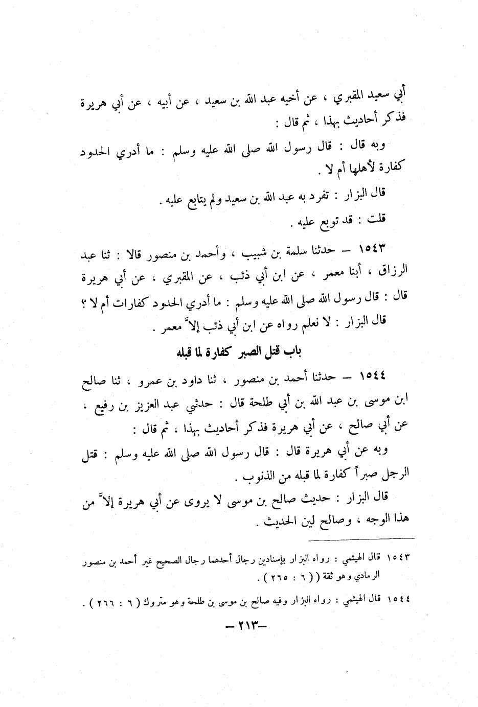 1544 - حَدَّثَنَا أَحْمَدُ بْنُ مَنْصُورٍ، ثنا دَاوُد بْنُ عَمْرٍو، ثنا صَالِحُ بْنُ مُوسَى بْنِ عَبْدِ اللَّهِ بْنِ أَبِي طَلْحَةَ، قَالَ: حَدَّثَنِي عَبْدُ الْعَزِيزِ بْنُ رُفَيْعٍ، عَنْ أَبِي صَالِحٍ، عَنْ أَبِي هُرَيْرَةَ، فَذَكَرَ أَحَادِيثَ بِهَذَا، ثُمَّ قَالَ: وَبِهِ عَنْ أَبِي هُرَيْرَةَ، قَالَ: قَالَ رَسُولُ اللَّهِ صَلَّى اللَّهُ عَلَيْهِ وَسَلَّمَ: «قَتْلُ الرَّجُلِ صَبْرًا كَفَّارَةٌ لِمَا قَبْلَهُ مِنَ الذُّنُوبِ» .