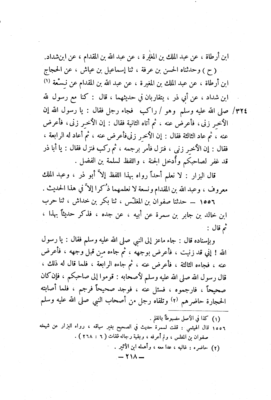 بْنُ أَرْطَاةَ، عَنْ عَبْدِ الْمَلِكِ بْنِ الْمُغِيرَةِ، عَنْ عَبْدِ اللَّهِ بْنِ الْمِقْدَامِ، عَنِ ابْنِ شَدَّادٍ، (ح) وَحَدَّثَنَاهُ الْحَسَنُ بْنُ عَرَفَةَ، ثنا إِسْمَاعِيلُ بْنُ عَيَّاشٍ، عَنِ الْحَجَّاجِ بْنِ أَرْطَاةَ، عَنْ عَبْدِ الْمَلِكِ بْنِ الْمُغِيرَةِ، عَنْ عَبْدِ اللَّهِ بْنِ الْمِقْدَامِ، عَنْ نِسْعَةَ بْنِ شَدَّادٍ، عَنْ أَبِي ذَرٍّ، يَتَقَارَبَانِ فِي حَدِيثِهِمَا، قَالَ: كُنَّا مَعَ رَسُولِ اللَّهِ صَلَّى اللَّهُ عَلَيْهِ وَسَلَّمَ وَهُوَ رَاكِبٌ فَجَاءَ رَجُلٌ، فَقَالَ: يَا رَسُولَ اللَّهِ، إِنَّ الآخَرَ زَنَى، فَأَعْرَضَ عَنْهُ، ثُمَّ أَتَاهُ الثَّانِيَةَ، فَقَالَ: إِنَّ الآخَرَ زَنَى، فَأَعْرَضَ عَنْهُ، ثُمَّ عَادَ الثَّالِثَةَ، فَقَالَ: إِنَّ الآخَرَ زَنَى فَأَعْرَضَ عَنْهُ، ثُمَّ أَعَادَ لَهُ الرَّابِعَةَ، فَقَالَ: إِنَّ الآخَرَ زَنَى، فَنَزَلَ فَأَمَرَ بِرَجْمِهِ، ثُمَّ رَكَبَ فَنَزَلَ، فَقَالَ: «يَا أَبَا ذَرٍّ، قَدْ غُفِرَ لِصَاحِبِكُمْ وَأُدْخِلَ الْجَنَّةَ» ، وَاللَّفْظُ لِسَلَمَةَ بْنِ الْفَضْلِ.
