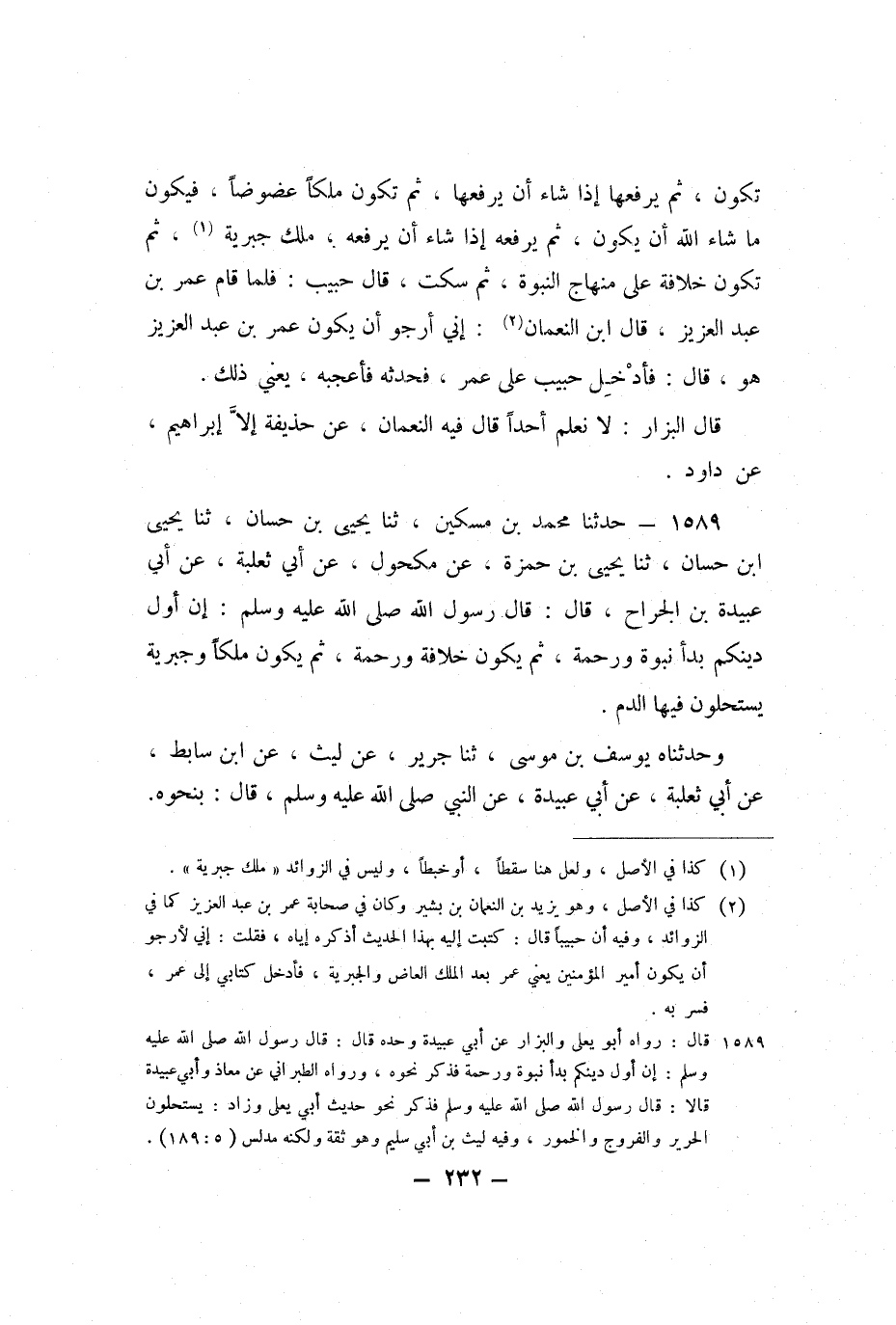 تَكُونَ، ثُمَّ يَرْفَعُهَا إِذَا شَاءَ أَنْ يَرْفَعَهَا، ثُمَّ تَكُونُ مُلْكًا عَضُوضًا، فَيَكُونُ مَا شَاءَ اللَّهُ أَنْ يَكُونَ، ثُمَّ يَرْفَعُهُ إِذَا شَاءَ أَنْ يَرْفَعَهُ، ملك جبرية، ثُمَّ تَكُونُ خِلافَةٌ عَلَى مِنْهَاجِ النُّبُوَّةِ» ، ثُمَّ سَكَتَ، قَالَ حَبِيبٌ: فَلَمَّا قَامَ عُمَرُ بْنُ عَبْدِ الْعَزِيزِ، قَالَ ابْنُ النُّعْمَانِ: إِنِّي أَرُجو أَنْ يَكُونَ عُمَرُ بْنُ عَبْدِ الْعَزِيزِ هُوَ، قَالَ: فَأُدْخِلَ حَبِيبٌ عَلَى عُمَرَ، فَحَدَّثَهُ فَأَعْجَبَهُ، يَعْنِي ذَلِكَ.