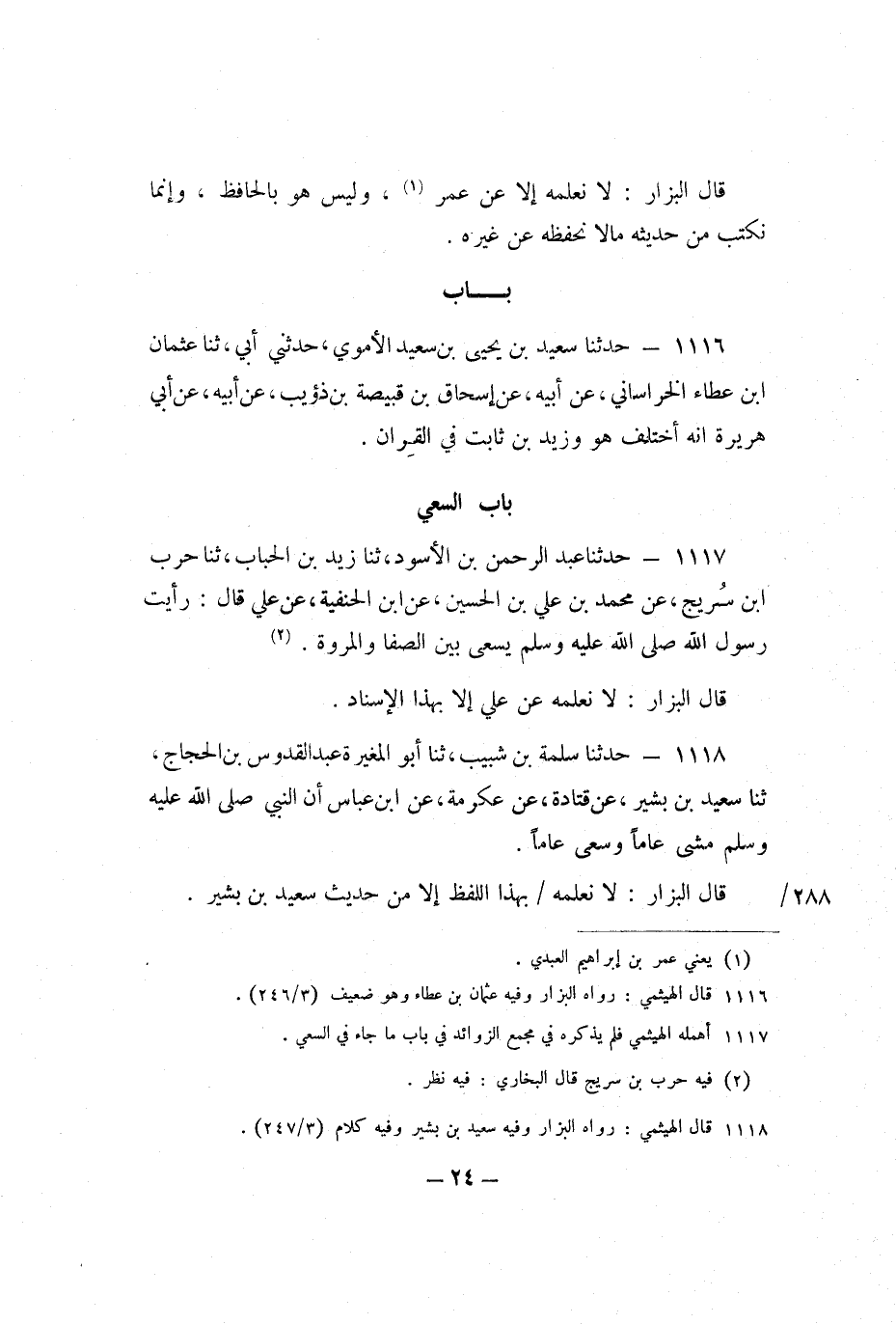 1117 - حَدَّثَنَا عَبْدُ الرَّحْمَنِ بْنُ الأَسْوَدِ، ثنا زَيْدُ بْنُ الْحُبَابِ، ثنا حَرْبُ بْنُ سُرَيْجٍ، عَنْ مُحَمَّدِ بْنِ عَلِيِّ بْنِ الْحُسَيْنِ، عَنِ ابْنِ الْحَنَفِيَّةِ، عَنْ عَلِيٍّ، قَالَ: رَأَيْتُ رَسُولَ اللَّهِ صَلَّى اللَّهُ عَلَيْهِ وَسَلَّمَ يَسْعَى بَيْنَ الصَّفَا وَالْمَرْوَةِ.
