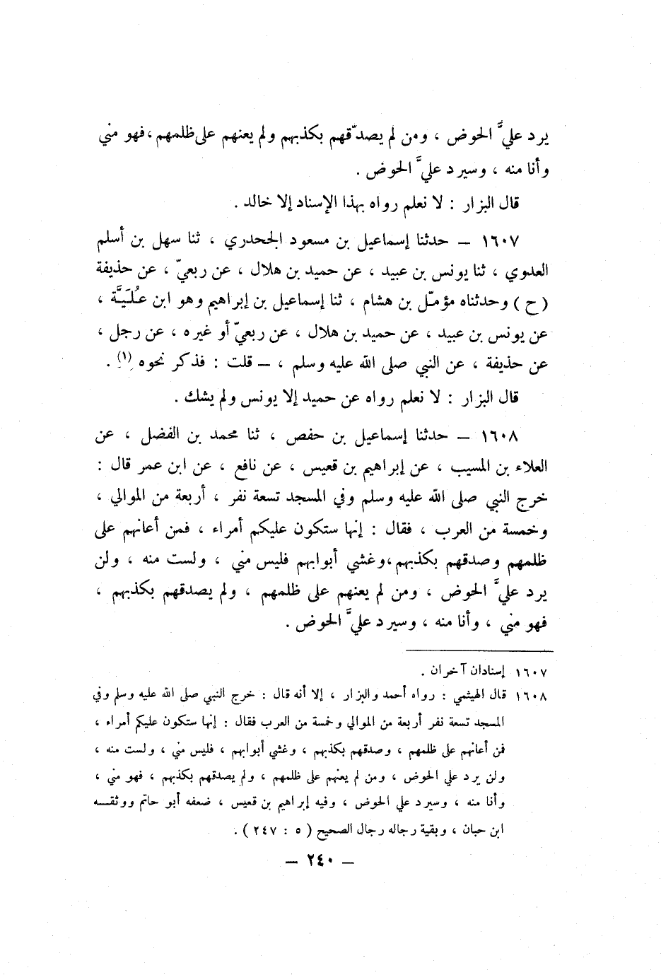 1608 - حَدَّثَنَا إِسْمَاعِيلُ بْنُ حَفْصٍ، ثنا مُحَمَّدُ بْنُ الْفَضْلِ، عَنِ الْعَلاءِ بْنِ الْمُسَيِّبِ، عَنْ إِبْرَاهِيمَ بْنِ قُعَيْسٍ، عَنْ نَافِعٍ، عَنِ ابْنِ عُمَرَ قَالَ: خَرَجَ النَّبِيُّ صَلَّى اللَّهُ عَلَيْهِ وَسَلَّمَ وَفِي الْمَسْجِدِ تِسْعَةُ نَفَرٍ، أَرْبَعَةٌ مِنَ الْمَوَالِي، وَخَمْسَةٌ مِنَ الْعَرَبِ، فَقَالَ: «إِنَّهَا سَتَكُونُ عَلَيْكُمْ أُمَرَاءُ، فَمَنْ أَعَانَهُمْ عَلَى ظُلْمِهِمْ وَصَدَّقَهُمْ بِكَذِبِهِمْ، وَغَشِيَ أَبْوَابَهُمْ فَلَيْسَ مِنِّي، وَلَسْتُ مِنْهُ، وَلَنْ يَرِدَ عَلَيَّ الْحَوْضَ، وَمَنْ لَمْ يُعِنْهُمْ عَلَى ظُلْمِهِمْ، وَلَمْ يُصَدِّقْهُمْ بِكَذِبِهِمْ، فَهُوَ مِنِّي، وَأَنَا مِنْهُ، وَسَيَرِدُ عَلَيَّ الْحَوْضَ» .