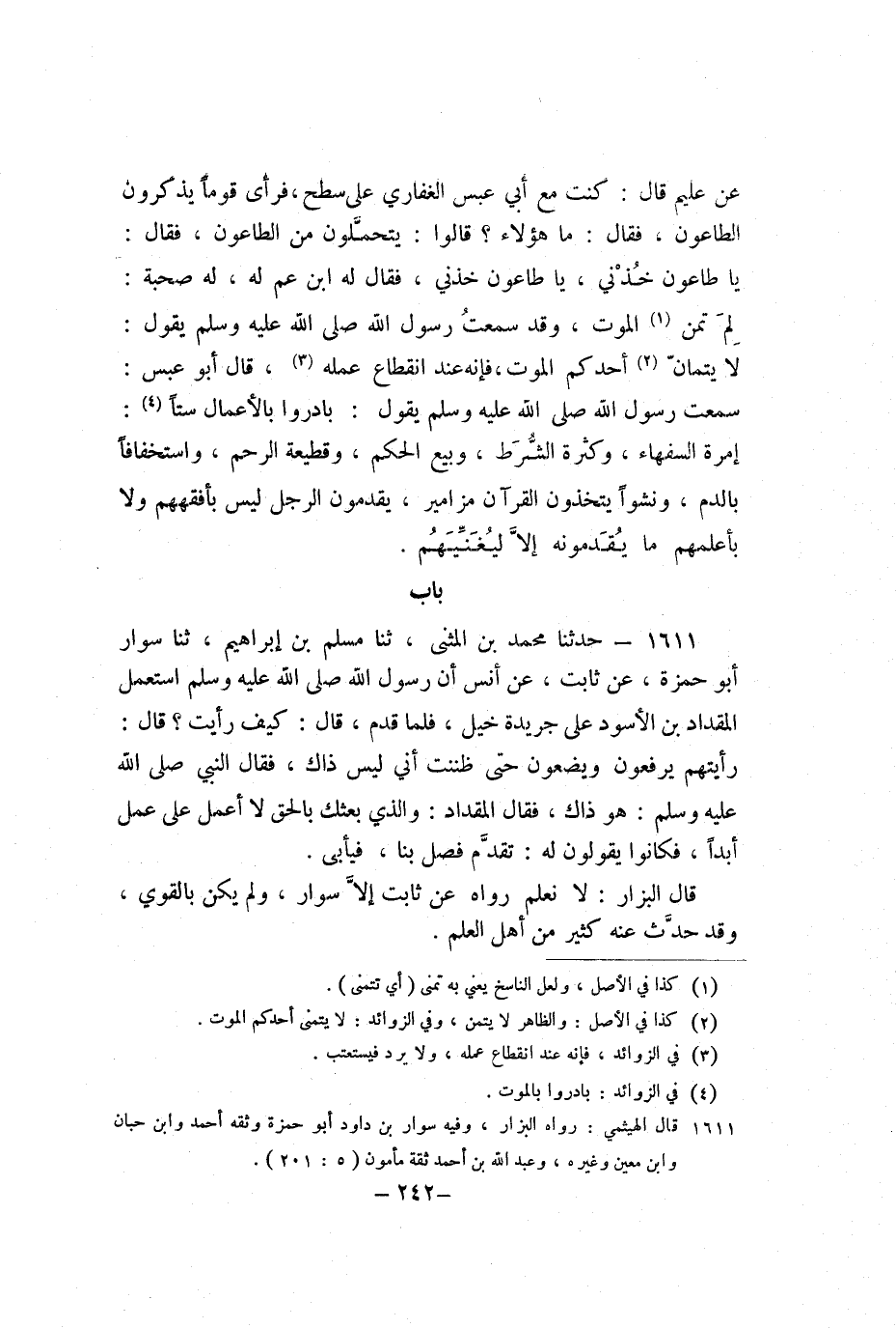 1611 - حَدَّثَنَا مُحَمَّدُ بْنُ الْمُثَنَّى، ثنا مُسْلِمُ بْنُ إِبْرَاهِيمَ، ثنا سَوَّارٌ أَبُو حَمْزَةَ، عَنْ ثَابِتٍ، عَنْ أنَسٍ، أَنَّ رَسُولَ اللَّهِ صَلَّى اللَّهُ عَلَيْهِ وَسَلَّمَ اسْتَعْمَلَ الْمِقْدَادَ بْنَ الأَسْوَدِ عَلَى جَرِيدَةِ خَيْلٍ، فَلَمَّا قَدِمَ، قَالَ: «كَيْفَ رَأَيْتَ؟» قَالَ: رَأَيْتُهُمْ يَرْفَعُونَ وَيَضَعُونَ حَتَّى ظَنَنْتُ أَنِّي لَيْسَ ذَاكَ، فَقَالَ النَّبِيُّ صَلَّى اللَّهُ عَلَيْهِ وَسَلَّمَ: «هُوَ ذَاكَ» ، فَقَالَ الْمِقْدَادُ: وَالَّذِي بَعَثَكَ بِالْحَقِّ لا أَعْمَلُ عَلَى عَمَلٍ أَبَدًا، فَكَانُوا يَقُولُونَ لَهُ: تَقَدَّمْ فَصَلِّ بِنَا، فَيَأْبَى.