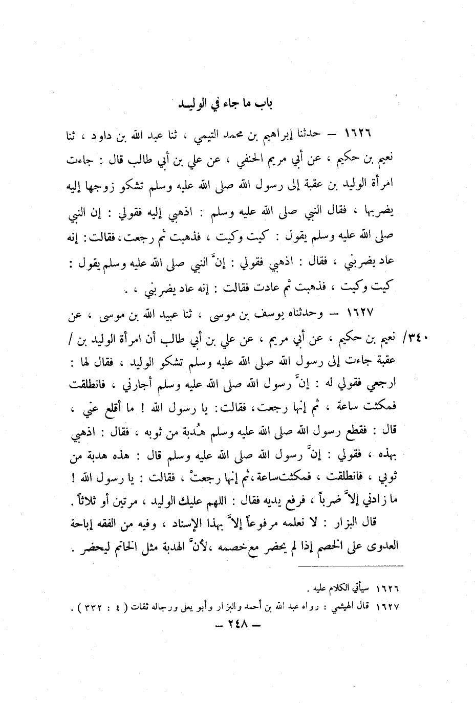 1626 - حَدَّثَنَا إِبْرَاهِيمُ بْنُ مُحَمَّدٍ التَّيْمِيُّ، ثنا عَبْدُ اللَّهِ بْنُ دَاوُد، ثنا نُعَيْمُ بْنُ حَكِيمٍ، عَنْ أَبِي مَرْيَمَ الْحَنَفِيِّ، عَنْ عَلِيِّ بْنِ أَبِي طَالِبٍ، قَالَ: جَاءَتِ امْرَأَةُ الْوَلِيدِ بْنِ عُقْبَةَ إِلَى رَسُولِ اللَّهِ صَلَّى اللَّهُ عَلَيْهِ وَسَلَّمَ تَشْكُو زَوْجَهَا إِلَيْهِ يَضْرِبُهَا، فَقَالَ النَّبِيُّ صَلَّى اللَّهُ عَلَيْهِ وَسَلَّمَ: " اذْهَبِي إِلَيْهِ فَقُولِي: إِنَّ النَّبِيَّ صَلَّى اللَّهُ عَلَيْهِ وَسَلَّمَ يَقُولُ: كَيْتَ وَكَيْتَ "، فَذَهَبَتْ ثُمَّ رَجَعَتْ، فَقَالَتْ: إِنَّهُ عَادَ يَضْرِبُنِي، فَقَالَ: " اذْهَبِي فَقُولِي: إِنَّ النَّبِيَّ صَلَّى اللَّهُ عَلَيْهِ وَسَلَّمَ يَقُولُ: كَيْتَ وَكَيْتَ "، فَذَهَبَتْ ثُمَّ عَادَتْ، فَقَالَتْ: إِنَّهُ عَادَ يَضْرِبُنِي.