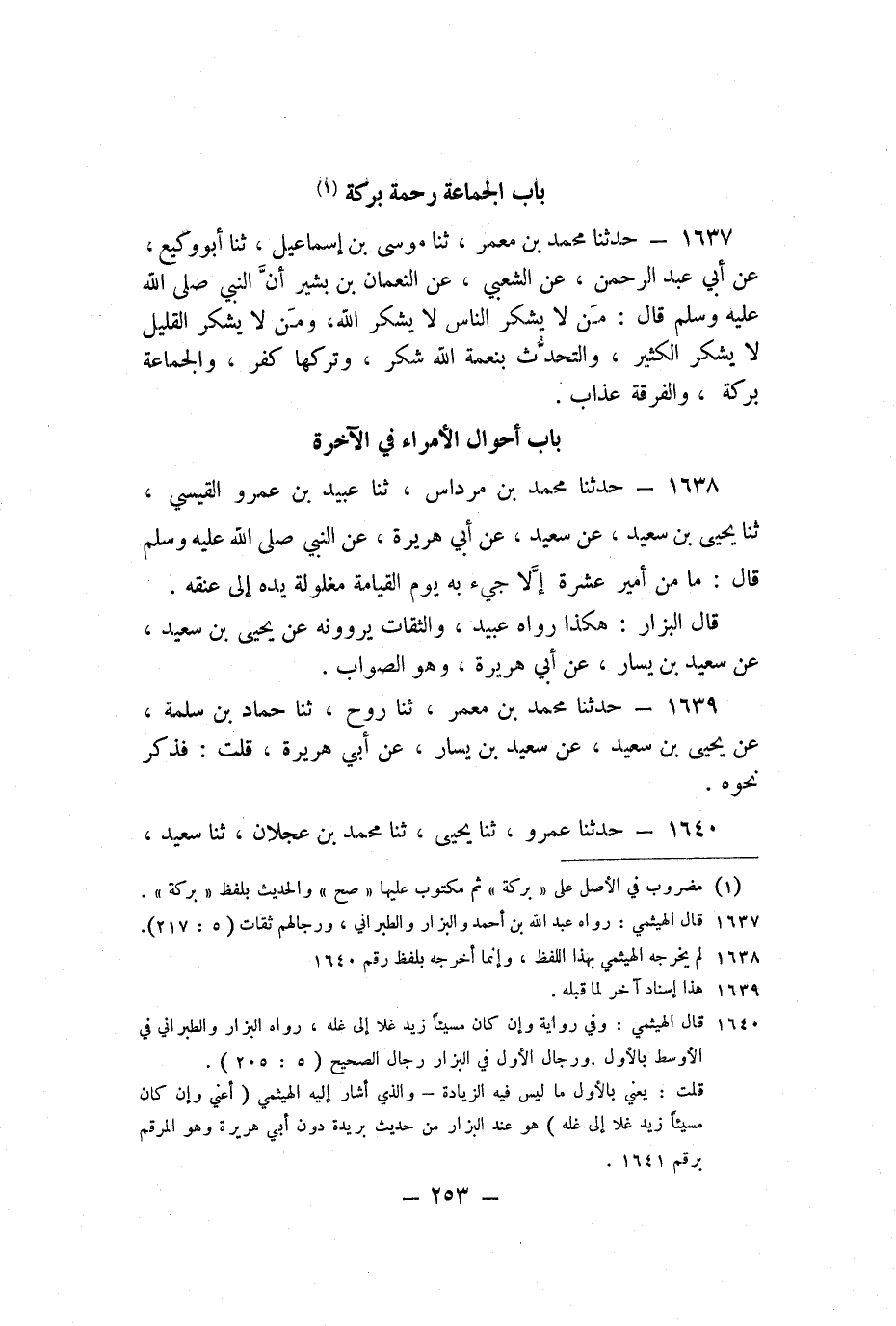 1637 - حَدَّثَنَا مُحَمَّدُ بْنُ مَعْمَرٍ، ثنا مُوسَى بْنُ إِسْمَاعِيلَ، ثنا أَبُو وَكِيعٍ، عَنْ أَبِي عَبْدِ الرَّحْمَنِ، عَنِ الشَّعْبِيِّ، عَنِ النُّعْمَانِ بْنِ بَشِيرٍ، أَنَّ النَّبِيَّ صَلَّى اللَّهُ عَلَيْهِ وَسَلَّمَ قَالَ: «مَنْ لا يَشْكُرِ النَّاسَ لا يَشْكُرِ اللَّهَ، وَمَنْ لا يَشْكُرِ الْقَلِيلَ لا يَشْكُرِ الْكَثِيرَ، وَالتَّحَدُّثُ بِنِعْمَةِ اللَّهِ شُكْرٌ، وَتَرْكُهَا كُفْرٌ، وَالْجَمَاعَةُ بَرَكَةٌ، وَالْفُرْقَةُ عَذَابٌ» .