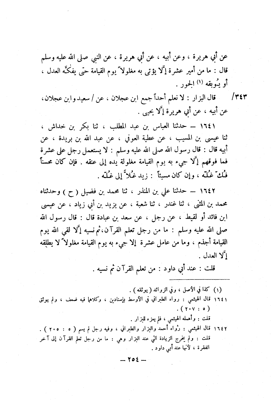 1641 - حَدَّثَنَا الْعَبَّاسُ بْنُ عَبْدِ الْمُطَّلِبِ، ثنا بَكْرُ بْنُ خِدَاشٍ، ثنا عِيسَى بْنُ الْمُسَيِّبِ، عَنْ عَطِيَّةَ الْعَوْفِيِّ، عَنْ عَبْدِ اللَّهِ بْنِ بُرَيْدَةَ، عَنْ أَبِيهِ، قَالَ: قَالَ رَسُولُ اللَّهِ صَلَّى اللَّهُ عَلَيْهِ وَسَلَّمَ: «لا يُسْتَعْمَلُ رَجُلٌ عَلَى عَشَرَةٍ فَمَا فَوْقَهُمْ إِلا جِيءَ بِهِ يَوْمَ الْقِيَامَةِ مَغْلُولَةً يَدُهُ إِلَى عُنُقِهِ، فَإِنْ كَانَ مُحْسِنًا فُكَّ غُلُّهُ، وَإِنْ كَانَ مُسِيئًا، زِيدَ غُلًّا إِلَى غُلِّهِ» .