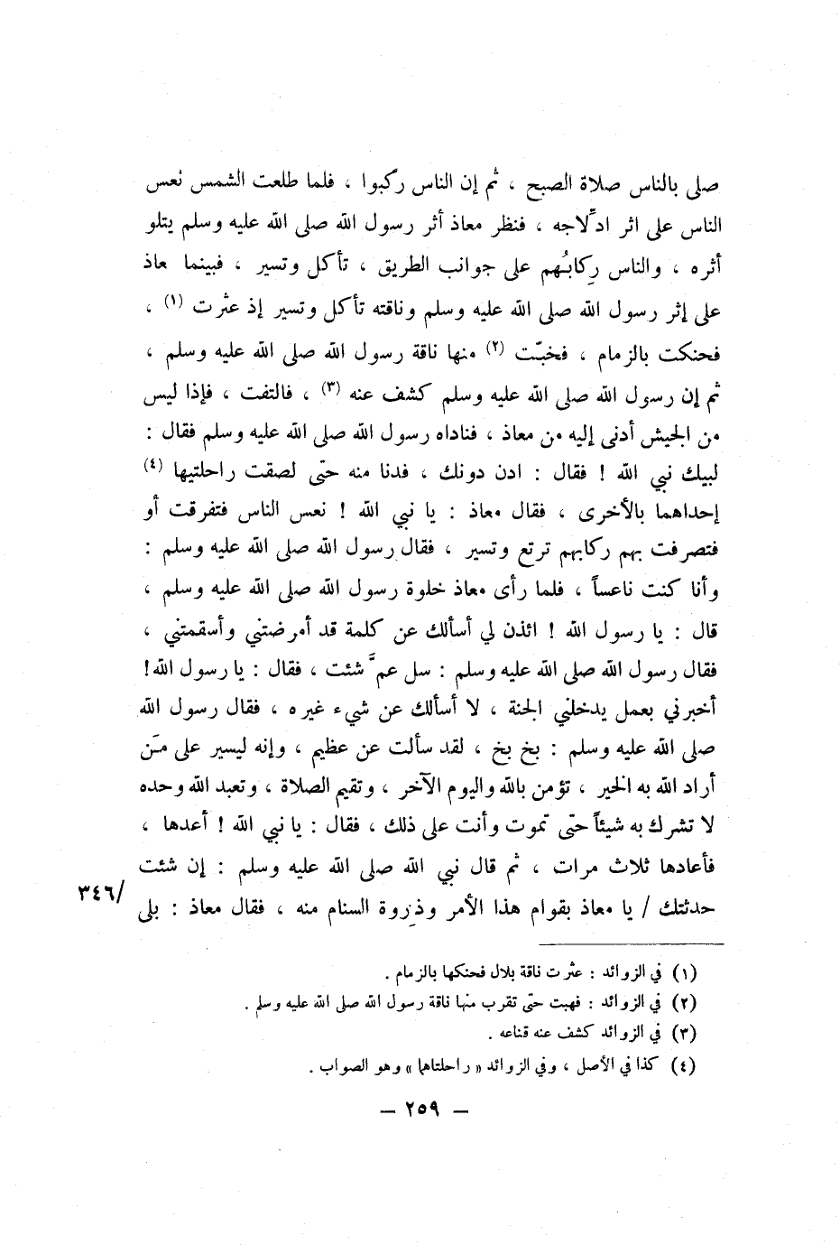 صَلَّى بِالنَّاسِ صَلاةَ الصُّبْحِ، ثُمَّ إِنَّ النَّاسَ رَكِبُوا، فَلَمَّا طَلَعَتِ الشَّمْسُ نَعَسَ النَّاسُ عَلَى أَثَرِ إدْلاجِهِ، فَنَظَرَ مُعَاذٌ أَثَرَ رَسُولِ اللَّهِ صَلَّى اللَّهُ عَلَيْهِ وَسَلَّمَ يَتْلُو أَثَرَهُ، وَالنَّاسُ رِكَابُهُمْ عَلَى جَوَانِبِ الطَّرِيقِ، تَأْكُلُ وَتَسِيرُ، فَبَيْنَمَا مُعَاذٌ عَلَى إِثْرِ رَسُولِ اللَّهِ صَلَّى اللَّهُ عَلَيْهِ وَسَلَّمَ وَنَاقَتُهُ تَأْكُلُ وَتَسِيرُ إِذْ عَثَرَتْ، فَكَبَحَهَا بِالزِّمَامِ، فَهَبَّتْ مِنْهَا نَاقَةُ رَسُولِ اللَّهِ صَلَّى اللَّهُ عَلَيْهِ وَسَلَّمَ، ثُمَّ إِنَّ رَسُولَ اللَّهِ صَلَّى اللَّهُ عَلَيْهِ وَسَلَّمَ كَشَفَ عَنْهُ، فَالْتَفَتَ، فَإِذَا لَيْسَ مِنَ الْجَيْشِ أَدْنَى إِلَيْهِ مِنْ مُعَاذٍ، فَنَادَاهُ رَسُولُ اللَّهِ صَلَّى اللَّهُ عَلَيْهِ وَسَلَّمَ، فَقَالَ: لَبَّيْكَ نَبِيَّ اللَّهِ، فَقَالَ: «ادْنُ دُونَكَ» ، فَدَنَا مِنْهُ حَتَّى لَصِقَتْ رَاحِلَتَاهُمَا إِحْدَاهُمَا بِالأُخْرَى، فَقَالَ مُعَاذٌ: يَا نَبِيَّ اللَّهِ، نَعَسَ النَّاسُ فَتَفَرَّقَتْ أَوْ فَتَصَرَّفَتْ بِهِمْ رِكَابُهُمْ تَرْتَعُ وَتَسِيرُ، فَقَالَ رَسُولُ اللَّهِ صَلَّى اللَّهُ عَلَيْهِ وَسَلَّمَ: «وَأَنَا كُنْتُ نَاعِسًا» ، فَلَمَّا رَأَى مُعَاذٌ خَلْوَةَ رَسُولِ اللَّهِ صَلَّى اللَّهُ عَلَيْهِ وَسَلَّمَ، قَالَ: يَا رَسُولَ اللَّهِ، ائْذَنْ لِي أَسْأَلُكَ عَنْ كَلِمَةٍ قَدْ أَمْرَضَتْنِي وَأَسْقَمَتْنِي، فَقَالَ رَسُولُ اللَّهِ صَلَّى اللَّهُ عَلَيْهِ وَسَلَّمَ: «سَلْ عَمَّ شِئْتَ» ، فَقَالَ: يَا رَسُولَ اللَّهِ، أَخْبِرْنِي بِعَمَلٍ يُدْخِلُنِي الْجَنَّةَ، لا أَسْأَلُكَ عَنْ شَيْءٍ غَيْرِهِ، فَقَالَ رَسُولُ اللَّهِ صَلَّى اللَّهُ عَلَيْهِ وَسَلَّمَ: «بَخٍ بَخٍ، لَقَدْ سَأَلْتَ عَنْ عَظِيمٍ، وَإِنَّهُ لَيَسِيرُ عَلَى مَنْ أَرَادَ اللَّهُ بِهِ الْخَيْرَ؛ تُؤْمِنُ بِاللَّهِ وَالْيَوْمِ الآخِرِ، وَتُقِيمُ الصَّلاةَ، وَتَعْبُدُ اللَّهَ وَحْدَهُ لا تُشْرِكُ بِهِ شَيْئًا حَتَّى تَمُوتَ وَأَنْتَ عَلَى ذَلِكَ» ، فَقَالَ: يَا نَبِيَّ اللَّهِ، أَعِدْهَا، فَأَعَادَهَا ثَلاثَ مَرَّاتٍ، ثُمَّ قَالَ نَبِيُّ اللَّهِ صَلَّى اللَّهُ عَلَيْهِ وَسَلَّمَ: «إِنْ شِئْتَ حَدَّثْتُكَ يَا مُعَاذُ بِقِوَامِ هَذَا الأَمْرِ وَذِرْوَةِ السَّنَامِ مِنْهُ» ، فَقَالَ مُعَاذٌ: بَلَى