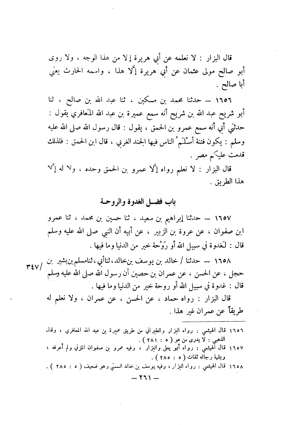 1657 - حَدَّثَنَا إِبْرَاهِيمُ بْنُ سَعِيدٍ، ثنا حُسَيْنُ بْنُ مُحَمَّدٍ، ثنا عَمْرُو بْنُ صَفْوَانَ، عَنْ عُرْوَةَ بْنِ الزُّبَيْرِ، عَنْ أَبِيهِ، أَنَّ النَّبِيَّ صَلَّى اللَّهُ عَلَيْهِ وَسَلَّمَ، قَالَ: «لَغَدْوَةٌ فِي سَبِيلِ اللَّهِ أَوْ رَوْحَةٌ خَيْرٌ مِنَ الدُّنْيَا وَمَا فِيهَا» .