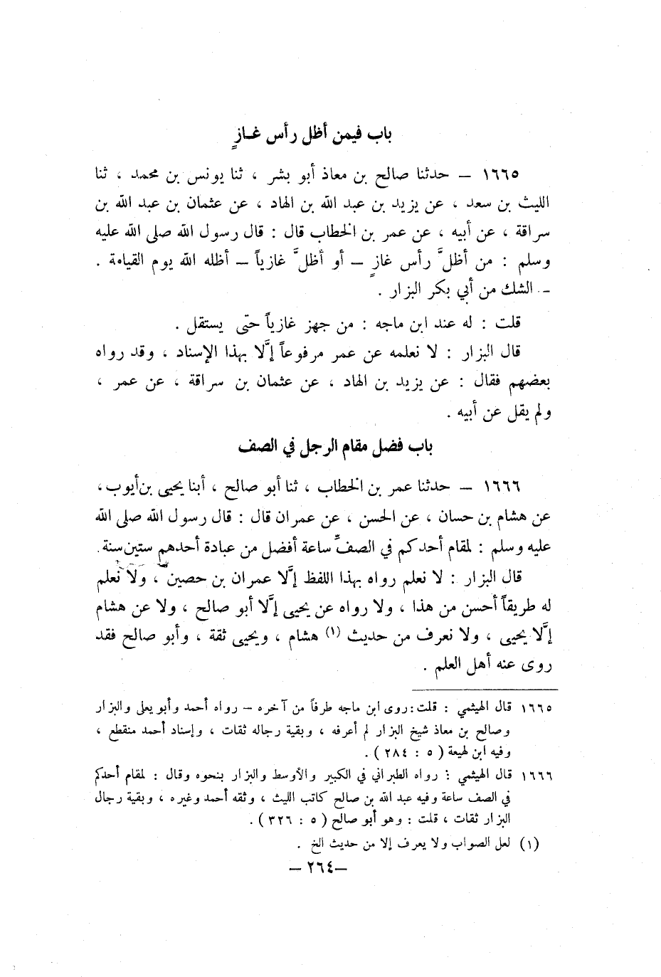 1665 - حَدَّثَنَا صَالِحُ بْنُ مُعَاذٍ أَبُو بِشْرٍ، ثنا يُونُسُ بْنُ مُحَمَّدٍ، ثنا اللَّيْثُ بْنُ سَعْدٍ، عَنْ يَزِيدَ بْنِ عَبْدِ اللَّهِ بْنِ الْهَادِ، عَنْ عُثْمَانَ بْنِ عَبْدِ اللَّهِ بْنِ سُرَاقَةَ، عَنْ أَبِيهِ، عَنْ عُمَرَ بْنِ الْخَطَّابِ، قَالَ: قَالَ رَسُولُ اللَّهِ صَلَّى اللَّهُ عَلَيْهِ وَسَلَّمَ: «مَنْ أَظَلَّ رَأْسَ غَازٍ، أَوْ أَظَلَّ غَازِيًا، أَظَلَّهُ اللَّهُ يَوْمَ الْقِيَامَةِ» .