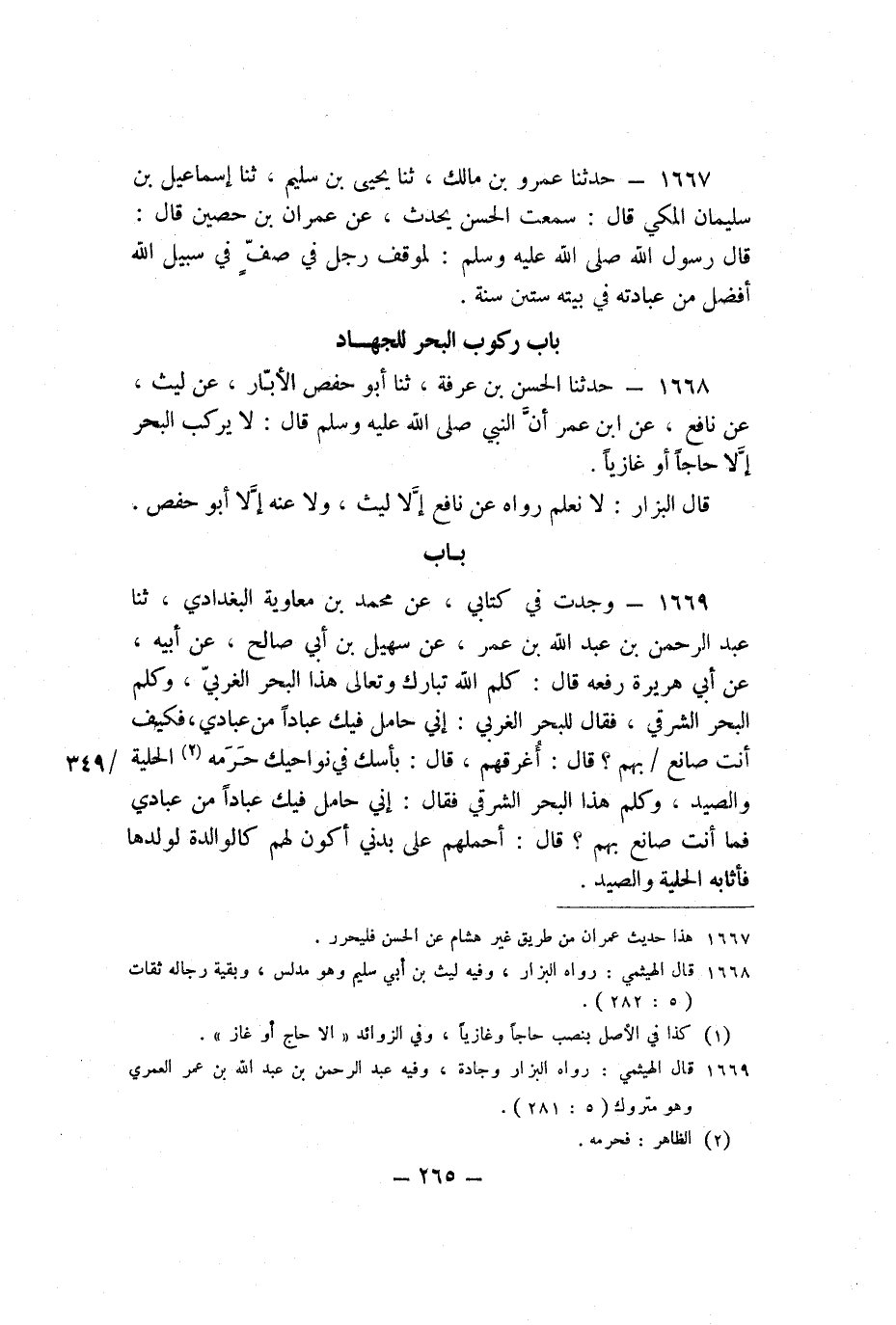1668 - حَدَّثَنَا الْحَسَنُ بْنُ عَرَفَةَ، ثنا أَبُو حَفْصٍ الأَبَّارُ، عَنْ لَيْثٍ، عَنْ نَافِعٍ، عَنِ ابْنِ عُمَرَ، أَنَّ النَّبِيَّ صَلَّى اللَّهُ عَلَيْهِ وَسَلَّمَ قَالَ: «لا يَرْكَبُ الْبَحْرَ إِلا حَاجًّا أَوْ غَازِيًا» .