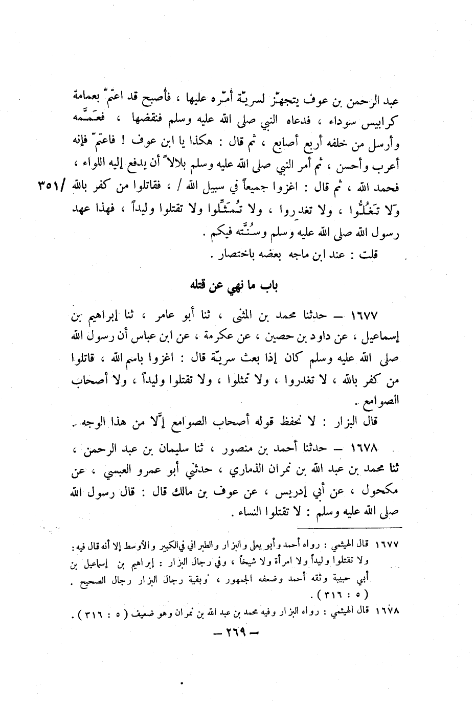 1678 - حَدَّثَنَا أَحْمَدُ بْنُ مَنْصُورٍ، ثنا سُلَيْمَانُ بْنُ عَبْدِ الرَّحْمَنِ، ثنا مُحَمَّدُ بْنُ عَبْدِ اللَّهِ بْنِ نِمْرَانَ الذِّمَارِيُّ، حَدَّثَنِي أَبُو عَمْرٍو الْعَبْسِيُّ، عَنْ مَكْحُولٍ، عَنْ أَبِي إِدْرِيسَ، عَنْ عَوْفِ بْنِ مَالِكٍ، قَالَ: قَالَ رَسُولُ اللَّهِ صَلَّى اللَّهُ عَلَيْهِ وَسَلَّمَ: «لا تَقْتُلُوا النِّسَاءَ» .
