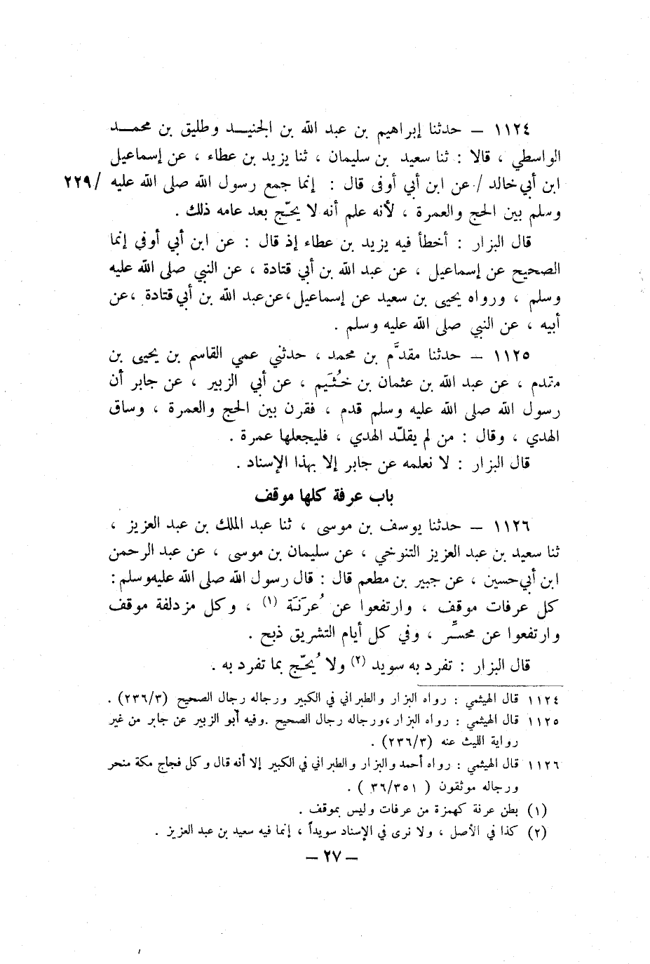 1124 - حَدَّثَنَا إِبْرَاهِيمُ بْنُ عَبْدِ اللَّهِ بْنِ الْجُنَيْدِ، وَطُلَيْقُ بْنُ مُحَمَّدٍ الْوَاسِطِيُّ، قَالا: ثنا سَعِيدُ بْنُ سُلَيْمَانَ، ثنا يَزِيدُ بْنُ عَطَاءٍ، عَنْ إِسْمَاعِيلَ ابْن أَبِي خَالِدٍ، عَنِ ابْنِ أَبِي أَوْفَى، قَالَ: إِنَّمَا جَمَعَ رَسُولُ اللَّهِ صَلَّى اللَّهُ عَلَيْهِ وَسَلَّمَ بَيْنَ الْحَجِّ وَالْعُمْرَةِ؛ لأَنَّهُ عَلِمَ أَنَّهُ لا يَحُجَّ بَعْدَ عَامِهِ ذَلِكَ.