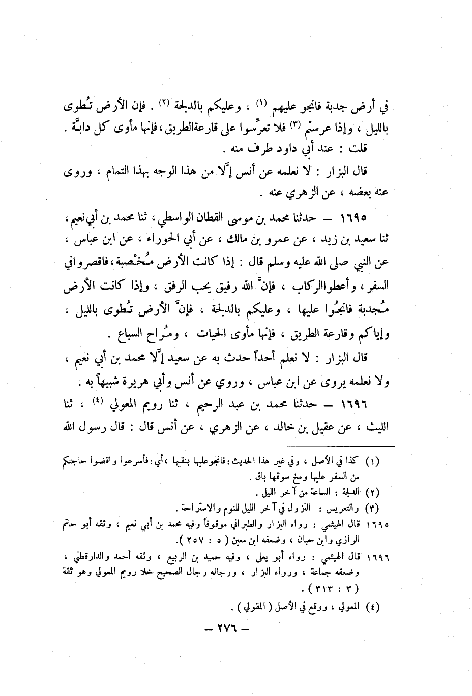 1695 - حَدَّثَنَا مُحَمَّدُ بْنُ مُوسَى الْقَطَّانُ الْوَاسِطِيُّ، ثنا مُحَمَّدُ بْنُ أَبِي نُعَيْمٍ، ثنا سَعِيدُ بْنُ زَيْدٍ، عَنْ عَمْرِو بْنِ مَالِكٍ، عَنْ أَبِي الْحَوْرَاءِ، عَنِ ابْنِ عَبَّاسٍ، عَنِ النَّبِيِّ صَلَّى اللَّهُ عَلَيْهِ وَسَلَّمَ، قَالَ: «إِذَا كَانَتِ الأَرْضُ مُخَصَّبَةً، فَاقْصُرُوا فِي السَّفَرِ، وَأَعْطُوا الرُّكَّابَ، فَإِنَّ اللَّهَ رَفِيقٌ يُحِبُّ الرِّفْقَ، وَإِذَا كَانَتِ الأَرْضُ مُجْدِبَةً فَانْجُوا عَلَيْهَا، وَعَلَيْكُمْ بِالدُّلْجَةِ، فَإِنَّ الأَرْضَ تُطْوَى بِاللَّيْلِ، وَإِيَّاكُمْ وَقَارِعَةَ الطَّرِيقِ، فَإِنَّهَا مَأْوَى الْحَيَّاتِ، وَمُرَاحُ السِّبَاعِ» .