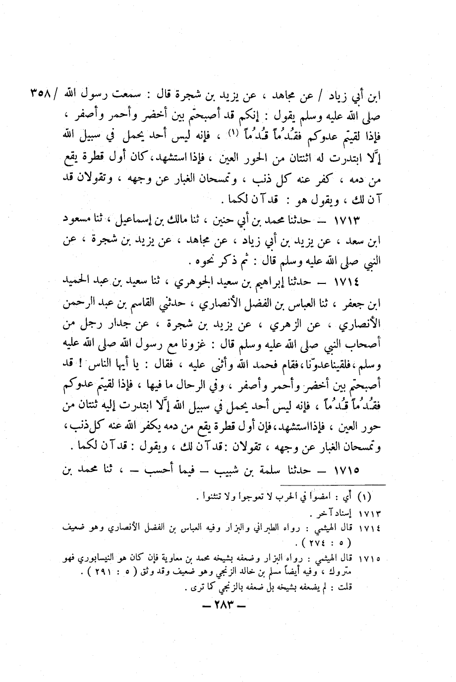 1713 - حَدَّثَنَا مُحَمَّدُ بْنُ أَبِي حُنَيْنٍ، ثنا مَالِكُ بْنُ إِسْمَاعِيلَ، ثنا مَسْعُودُ بْنُ سَعْدٍ، عَنْ يَزِيدَ بْنِ أَبِي زِيَادٍ، عَنْ مُجَاهِدٍ، عَنْ يَزِيدَ بْنِ شَجَرَةَ، عَنِ النَّبِيِّ صَلَّى اللَّهُ عَلَيْهِ وَسَلَّمَ، قَالَ: ...