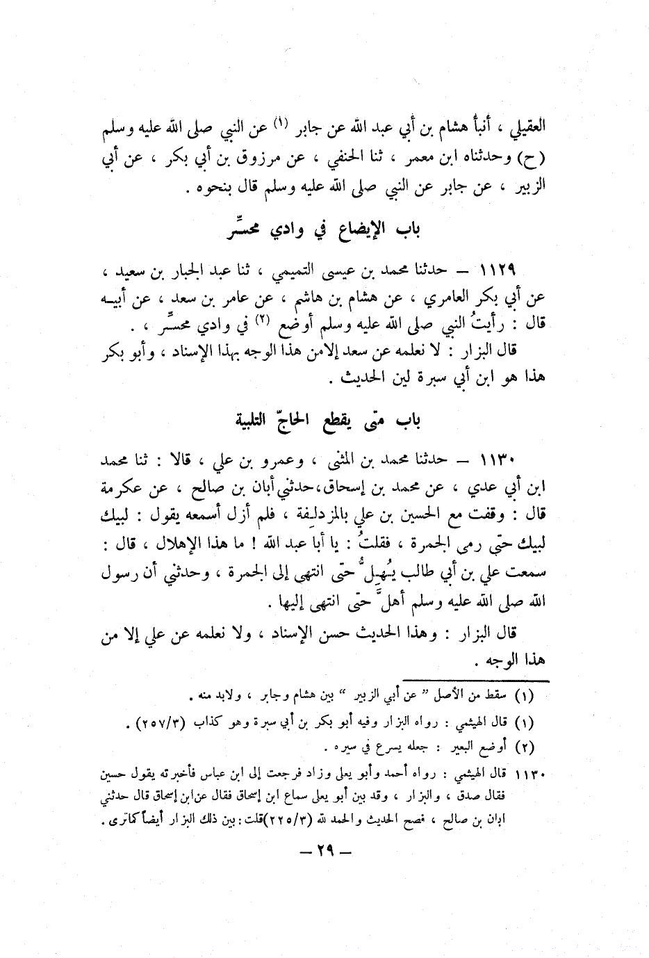 1129 - حَدَّثَنَا مُحَمَّدُ بْنُ عِيسَى التَّمِيمِيُّ، ثنا عَبْدُ الْجَبَّارِ بْنُ سَعِيدٍ، عَنْ أَبِي بَكْرٍ الْعَامِرِيِّ، عَنْ هِشَامِ بْنِ هَاشِمٍ، عَنْ عَامِرِ بْنِ سَعْدٍ، عَنْ أَبِيهِ، قَالَ: رَأَيْتُ النَّبِيَّ صَلَّى اللَّهُ عَلَيْهِ وَسَلَّمَ أَوْضَعَ فِي وَادِي مُحَسِّرٍ.