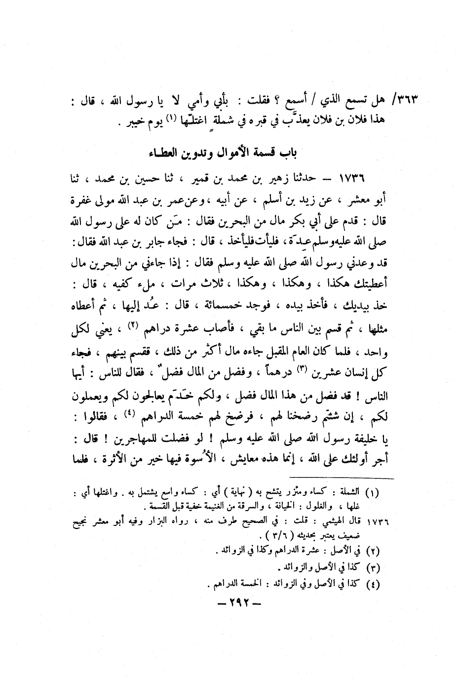 1736 - حَدَّثَنَا زُهَيْرُ بْنُ مُحَمَّدِ بْنِ قُمَيْرٍ، ثنا حُسَيْنُ بْنُ مُحَمَّدٍ، ثنا أَبُو مَعْشَرٍ، عَنْ زَيْدِ بْنِ أَسْلَمَ، عَنْ أَبِيهِ، وَعَنْ عُمَرَ بْنِ عَبْدِ اللَّهِ مَوْلَى غُفْرَةَ، قَالَ: قَدِمَ عَلَى أَبِي بَكْرٍ مَالٌ مِنَ الْبَحْرَيْنِ، فَقَالَ: مَنْ كَانَ لَهُ عَلَى رَسُولِ اللَّهِ صَلَّى اللَّهُ عَلَيْهِ وَسَلَّمَ عِدَةٌ، فَلْيَأْتِ فَلْيَأْخُذْ، قَالَ: فَجَاءَ جَابِرُ بْنُ عَبْدِ اللَّهِ، فَقَالَ: قَدْ وَعَدَنِي رَسُولُ اللَّهِ صَلَّى اللَّهُ عَلَيْهِ وَسَلَّمَ، فَقَالَ: إِذَا جَاءَنِي مِنَ الْبَحْرَيْنِ مَالٌ أَعْطَيْتُكَ هَكَذَا، وَهَكَذَا، وَهَكَذَا، ثَلاثَ مَرَّاتٍ، مِلْءَ كَفَّيْهِ، قَالَ: خُذْ بِيَدَيْكَ، فَأَخَذَ بِيَدِهِ، فَوَجَدَ خَمْسَ مِائَةٍ، قَالَ: عُدْ إِلَيْهَا، ثُمَّ أَعْطَاهُ مِثْلَهَا، ثُمَّ قَسَمَ بَيْنَ النَّاسِ مَا بَقِيَ، فَأَصَابَ عَشَرَةَ دَرَاهِمَ، يَعْنِي: لِكُلِّ وَاحِدٍ، فَلَمَّا كَانَ الْعَامُ الْمُقْبِلُ جَاءَهُ مَالٌ أَكْثَرُ مِنْ ذَلِكَ، فَقَسَمَ بَيْنَهُمْ، فَجَاءَ كُلَّ إِنْسَانٍ عِشْرُونَ دِرْهَمًا، وَفَضَلَ مِنَ الْمَالِ فَضْلٌ، فَقَالَ لِلنَّاسِ: أَيُّهَا النَّاسُ، قَدْ فَضَلَ مِنْ هَذَا الْمَالِ فَضْلٌ، وَلَكُمْ خَدَمٌ يُعَالِجُونَ لَكُمْ وَيَعْمَلُونَ لَكُمْ، إِنْ شِئْتُمْ رَضَخْنَا لَهُمْ، فَرَضَخَ لَهُمْ خَمْسَةَ الدَّرَاهِمِ، فَقَالُوا: يَا خَلِيفَةَ رَسُولِ اللَّهِ صَلَّى اللَّهُ عَلَيْهِ وَسَلَّمَ، لَوْ فَضَّلْتَ لِلْمُهَاجِرِينَ، قَالَ: أَجْرُ أُولَئِكَ عَلَى اللَّهِ، إِنَّمَا هَذِهِ مَعَايِشُ، الأُسْوَةُ فِيهَا خَيْرٌ مِنَ الأَثَرَةِ، فَلَمَّا